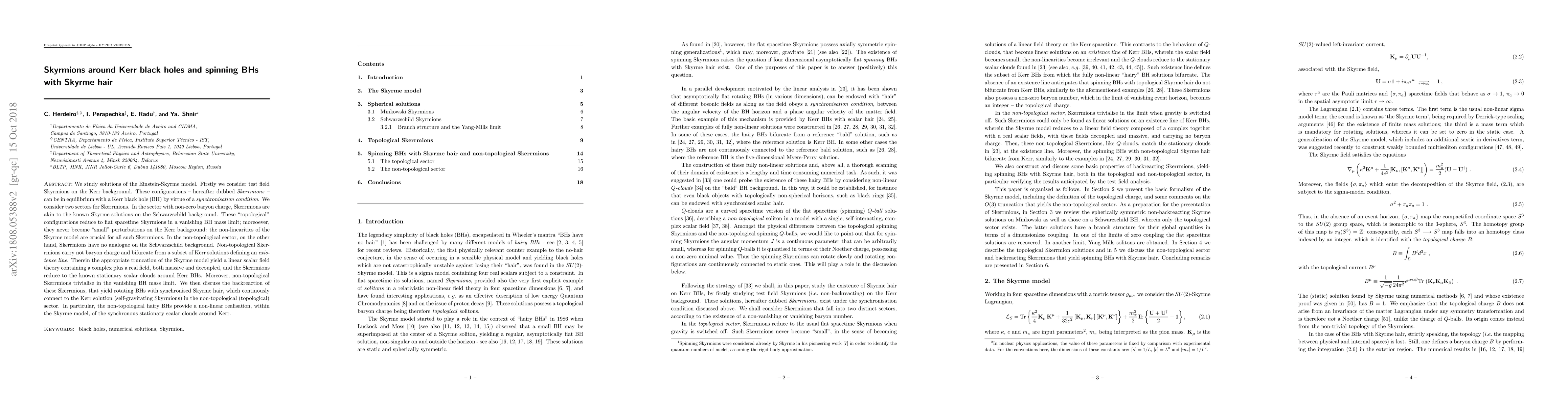 This paper explores the Einstein-Skyrme model, examining Skyrmion configurations around Kerr black holes (Skerrmions). It identifies two sectors: topological Skerrmions with baryon charge akin to Skyrme solutions around Schwarzschild BHs, and non-topological Skerrmions without baryon charge, which resemble stationary scalar clouds. The study also discusses the backreaction of Skerrmions, leading to rotating black holes with synchronised Skyrme hair.
