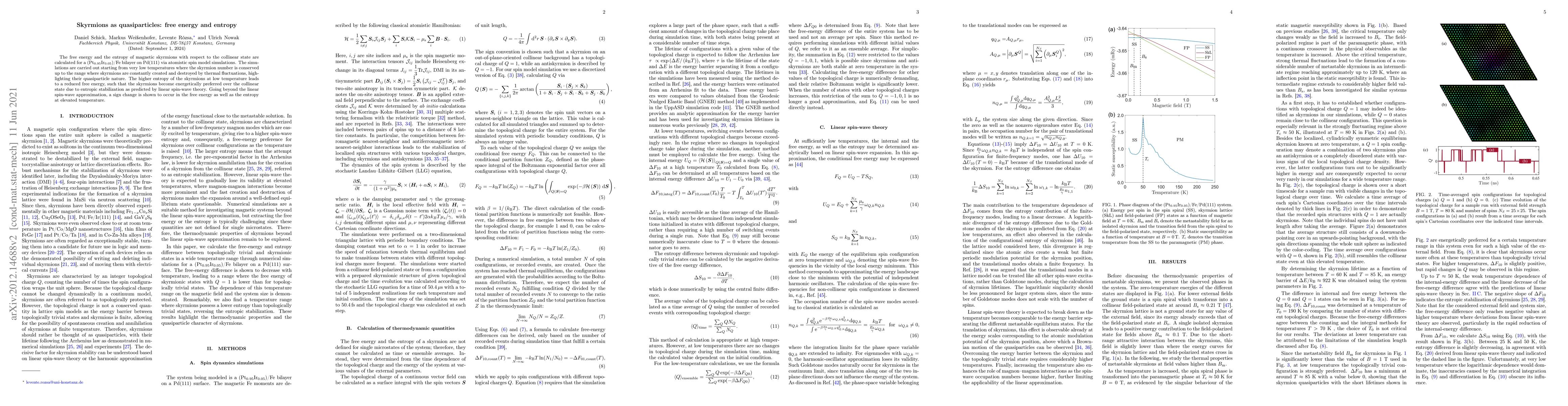 The free energy and the entropy of magnetic skyrmions with respect to the collinear state are calculated for a (Pt$_{0.95}$Ir$_{0.05}$)/Fe bilayer on Pd(111) via atomistic spin model simulations. The simulations are carried out starting from very low temperatures where the skyrmion number is conserved up to the range where skyrmions are constantly created and destroyed by thermal fluctuations, highlighting their quasiparticle nature. The higher entropy of the skyrmions at low temperature leads to a reduced free energy, such that the skyrmions become energetically preferred over the collinear state due to entropic stabilization as predicted by linear spin-wave theory. Going beyond the linear spin-wave approximation, a sign change is shown to occur in the free energy as well as the entropy at elevated temperature.