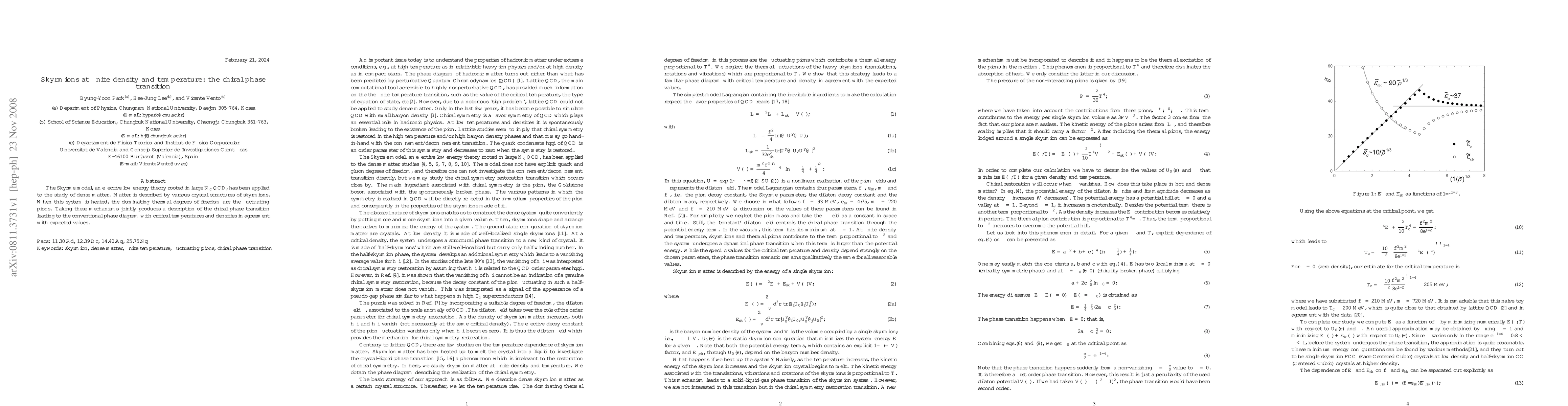 The Skyrme model, an effective low energy theory rooted in large $N_c$ QCD, has been applied to the study of dense matter. Matter is described by various crystal structures of skyrmions. When this system is heated, the dominating thermal degrees of freedom are the fluctuating pions. Taking these mechanisms jointly produces a description of the chiral phase transition leading to the conventional phase diagram with critical temperatures and densities in agreement with expected values.