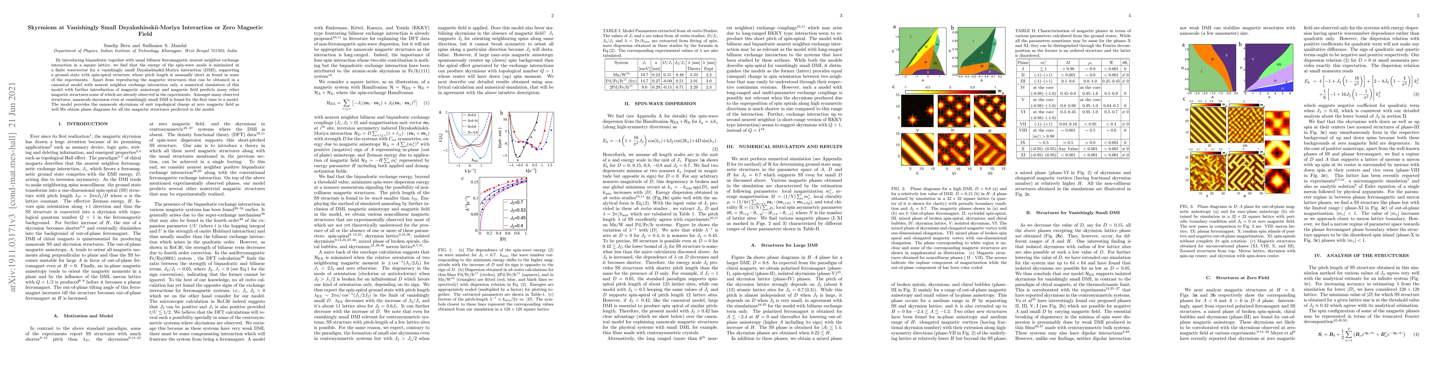 This research introduces a biquadratic exchange interaction in a square lattice to explore spin-wave modes, revealing nanoscale skyrmions at vanishingly small Dzyaloshinskii-Moriya interaction and zero magnetic field. The model also predicts various magnetic structures observed experimentally, including spin-spirals and skyrmions.