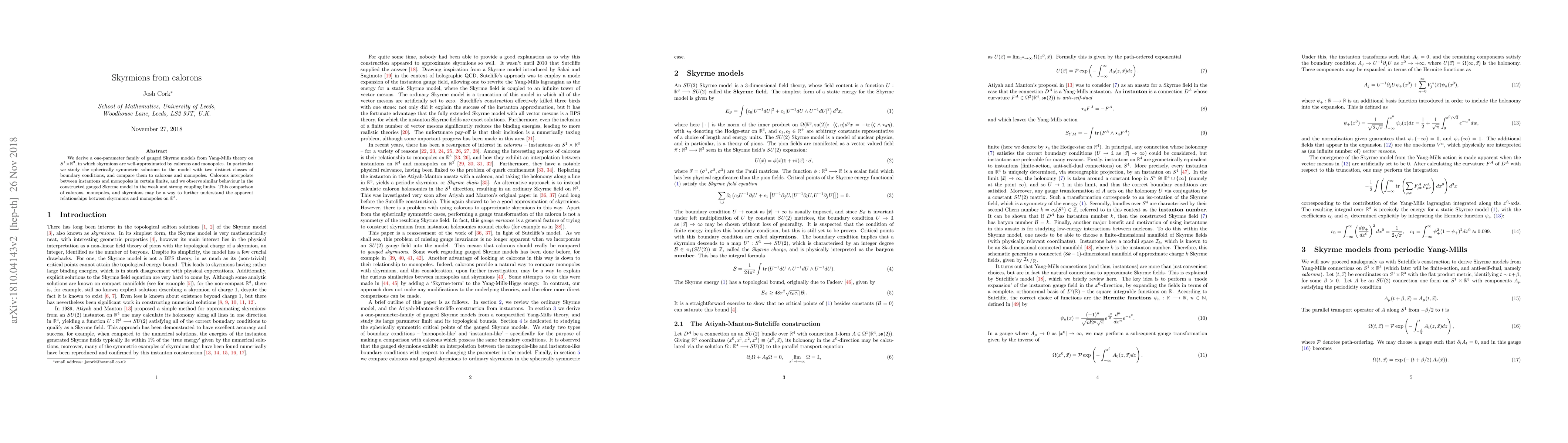 This paper derives gauged Skyrme models from Yang-Mills theory where skyrmions are approximated by calorons and monopoles. It examines spherically symmetric solutions under different boundary conditions, finding similarities between calorons, monopoles, and skyrmions in both weak and strong coupling regimes, potentially elucidating connections between skyrmions and monopoles in $\mathbb{R}^3$.