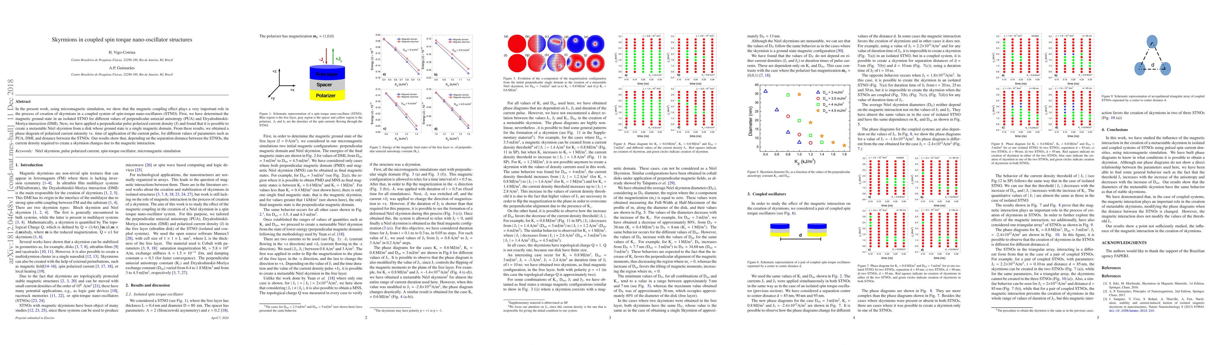 In the present work, using micromagnetic simulation, we show that the magnetic coupling effect plays a very important role in the process of creation of skyrmions in a coupled system of spin-torque nano-oscillators (STNO). First, we have determined the magnetic ground state in an isolated STNO for different values of perpendicular uniaxial anisotropy (PUA) and Dzyaloshinskii-Moriya interaction (DMI). Next, we have applied a perpendicular pulse polarized current density (J) and found that it is possible to create a metastable N\'eel skyrmion from a disk whose ground state is a single magnetic domain. From these results, we obtained a phase diagram of polarized current intensity vs. time of application of the current pulse, for different values of parameters such as PUA, DMI, and distance between the STNOs. Our results show that, depending on the separation distance between the STNOs, the current density required to create a skyrmion changes due to the magnetic interaction.