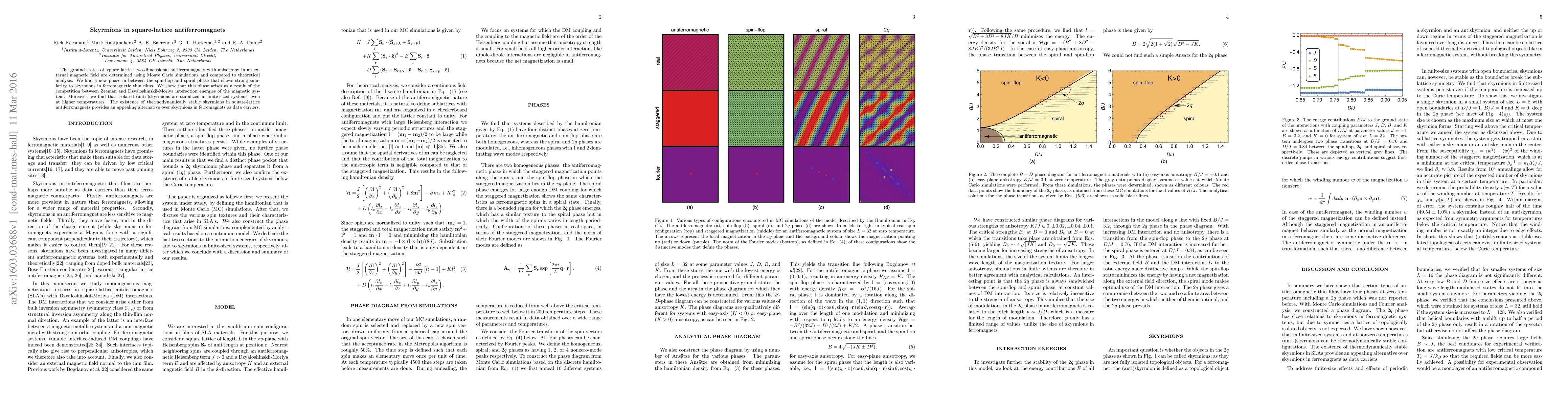The ground states of square lattice two-dimensional antiferromagnets with anisotropy in an external magnetic field are determined using Monte Carlo simulations and compared to theoretical analysis. We find a new phase in between the spin-flop and spiral phase that shows strong similarity to skyrmions in ferromagnetic thin films. We show that this phase arises as a result of the competition between Zeeman and Dzyaloshinskii-Moriya interaction energies of the magnetic system. Moreover, we find that isolated (anti-)skyrmions are stabilized in finite-sized systems, even at higher temperatures. The existence of thermodynamically stable skyrmions in square-lattice antiferromagnets provides an appealing alternative over skyrmions in ferromagnets as data carriers.