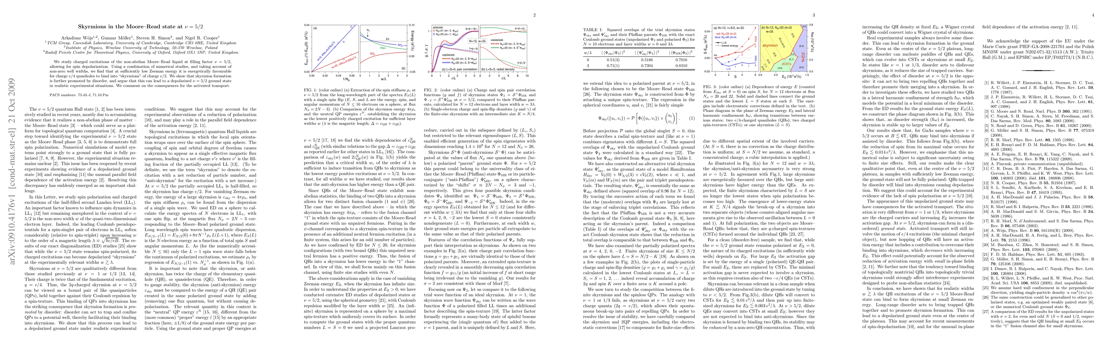 We study charged excitations of the non-abelian Moore-Read liquid at filling factor nu=5/2, allowing for spin depolarization. Using a combination of numerical studies, and taking account of non-zero well widths, we find that at sufficiently low Zeeman energy it is energetically favourable for charge e/4 quasiholes to bind into "skyrmions" of charge e/2. We show that skyrmion formation is further promoted by disorder, and argue that this can lead to a depolarized nu=5/2 ground state in realistic experimental situations. We comment on the consequences for the activated transport.