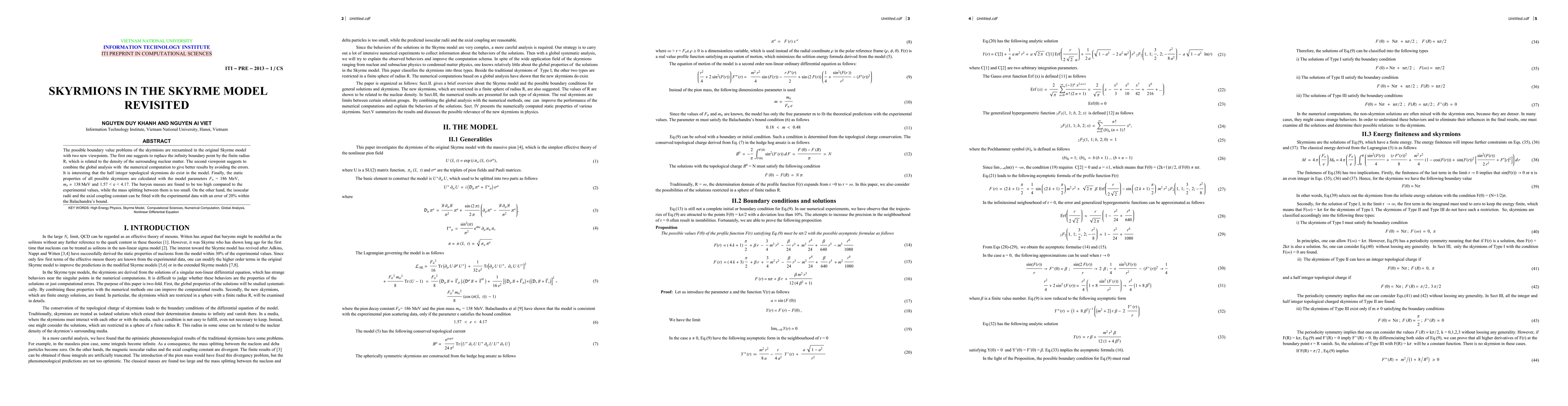 The possible boundary value problems of the skyrmions are reexamined in the original Skyrme model with two new viewpoints. The first one suggests to replace the infinity boundary point by the finite radius R, which is related to the density of the surrounding nuclear matter. The second viewpoint suggests to combine the global analysis with the numerical computation to give better results by avoiding the errors. It is interesting that the half integer topological skyrmions do exist in the model. Finally, the static properties of all possible skyrmions are calculated with the model parameters Subscript[F, \[Pi]] = 186 MeV, Subscript[m, \[Pi]]= 138 MeV and 1.57 < e < 4.17. The baryon masses are found to be too high compared to the experimental values, while the mass splitting between them is too small. On the other hand, the isoscalar radii and the axial coupling constant can be fitted with the experimental data with an error of 20% within the Balachandra's bound.