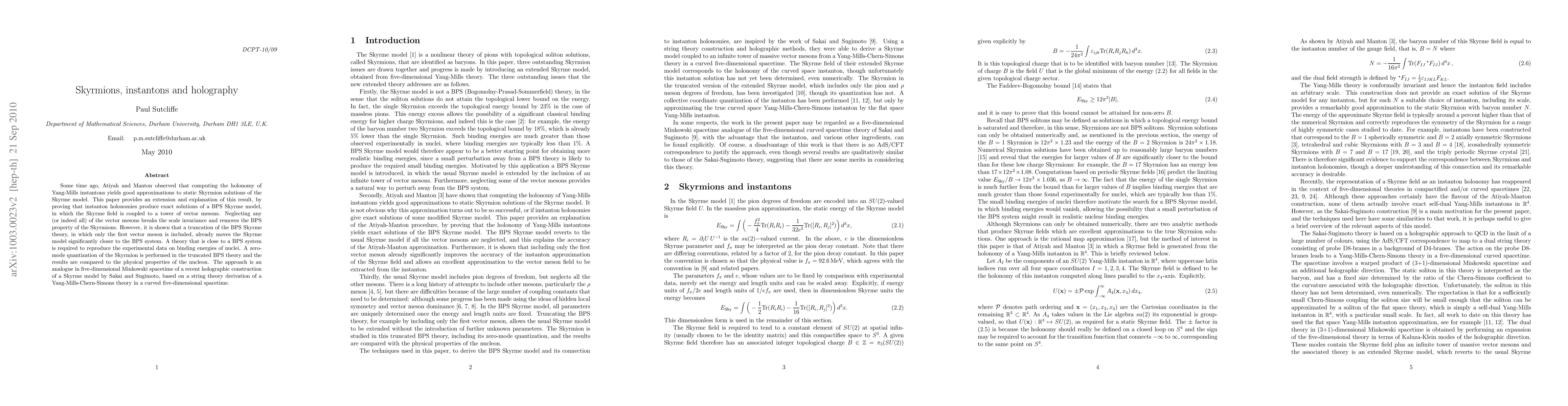This paper extends the observation that Yang-Mills instantons approximate static Skyrmion solutions, proving that instanton holonomies yield exact solutions in a BPS Skyrme model coupled to vector mesons. It demonstrates that including only the first vector meson brings the Skyrme model closer to a BPS system, necessary for matching nuclear binding energies, and compares these results to nucleon properties.