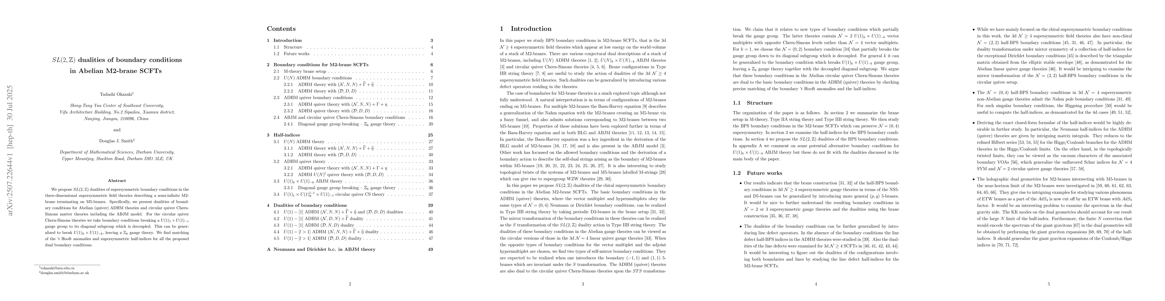 The research proposes $SL(2,\mathbb{Z})$ dualities for supersymmetric boundary conditions in three-dimensional field theories describing a semi-infinite M2-brane terminating on M5-branes, focusing on Abelian (quiver) ADHM theories and circular quiver Chern-Simons matter theories, including the ABJM model.