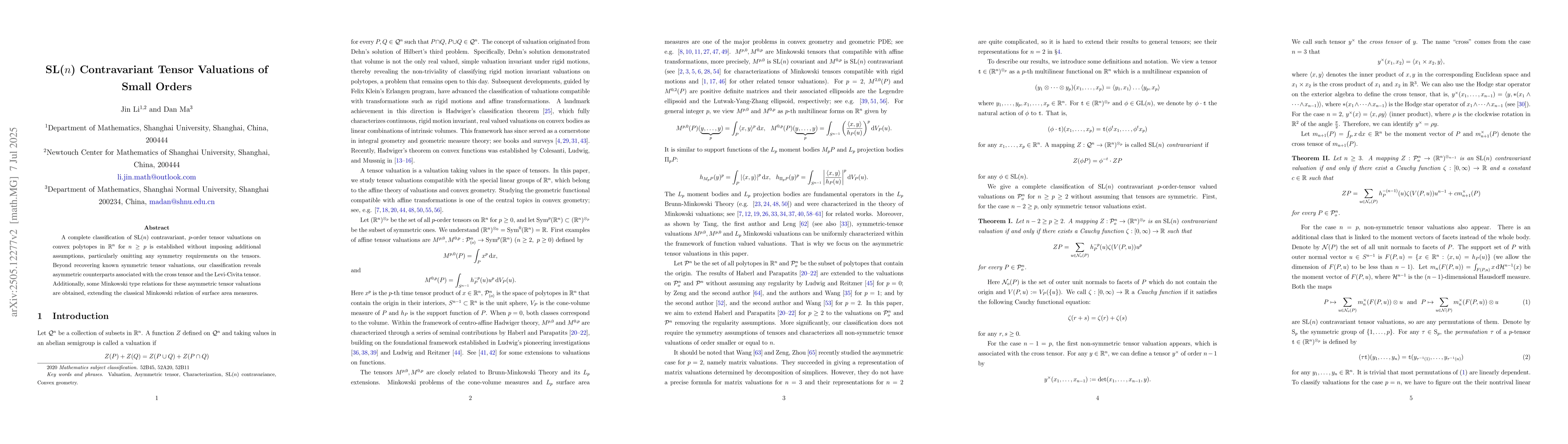The paper presents a comprehensive classification of contravariant tensor valuations under SL(n) for small orders, including both symmetric and asymmetric cases.
