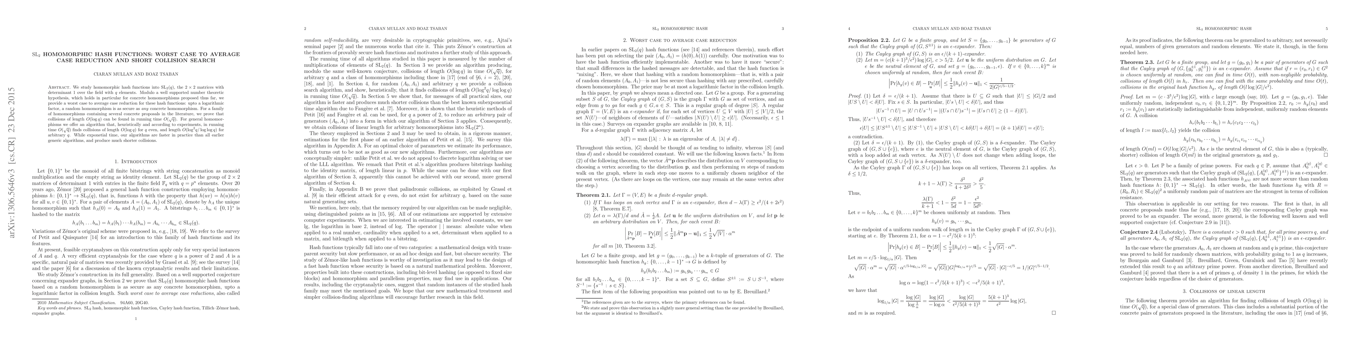This paper investigates homomorphic hash functions based on SL(2,q), demonstrating a worst case to average case reduction under a number-theoretic hypothesis. It also presents algorithms for finding short collisions in these hash functions, significantly improving upon previous methods.