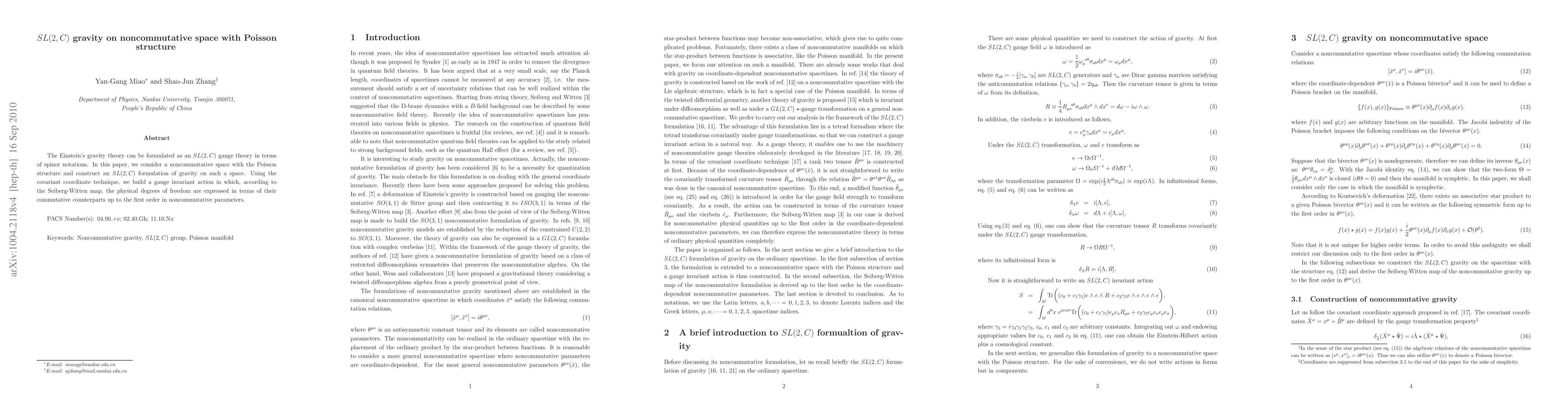 This paper formulates Einstein's gravity as an SL(2,C) gauge theory on a noncommutative space with a Poisson structure, constructing a gauge invariant action that relates physical degrees of freedom to their commutative counterparts using the Seiberg-Witten map.