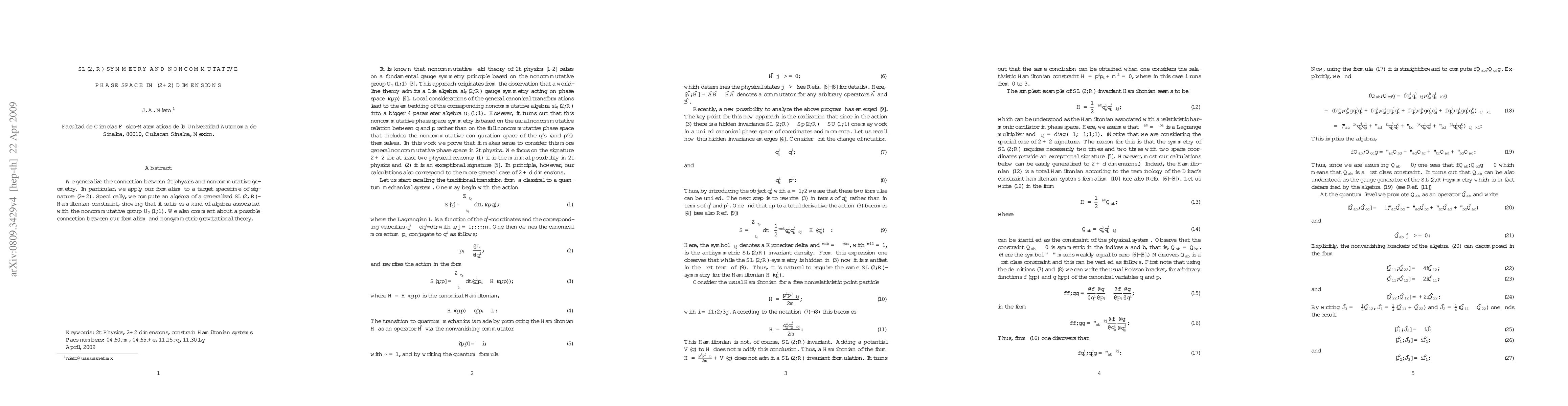 This paper generalizes the relationship between 2t physics and noncommutative geometry in a (2+2) dimensional target spacetime, demonstrating an algebra of an SL(2,R)-Hamiltonian constraint linked to the noncommutative group $U_{\star}(1,1)$ and speculates on its connection to nonsymmetric gravitational theory.