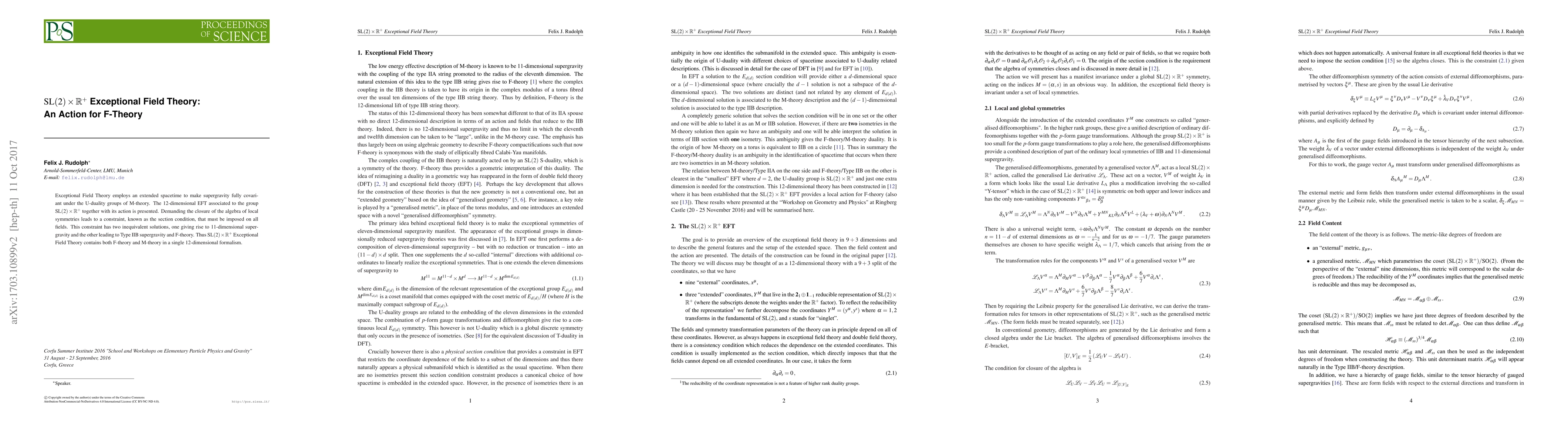 Exceptional Field Theory employs an extended spacetime to make supergravity fully covariant under the U-duality groups of M-theory. The 12-dimensional EFT associated to the group $SL(2)\times\mathbb{R}^+$ together with its action is presented. Demanding the closure of the algebra of local symmetries leads to a constraint, known as the section condition, that must be imposed on all fields. This constraint has two inequivalent solutions, one giving rise to 11-dimensional supergravity and the other leading to Type IIB supergravity and F-theory. Thus $SL(2)\times\mathbb{R}^+$ Exceptional Field Theory contains both F-theory and M-theory in a single 12-dimensional formalism.