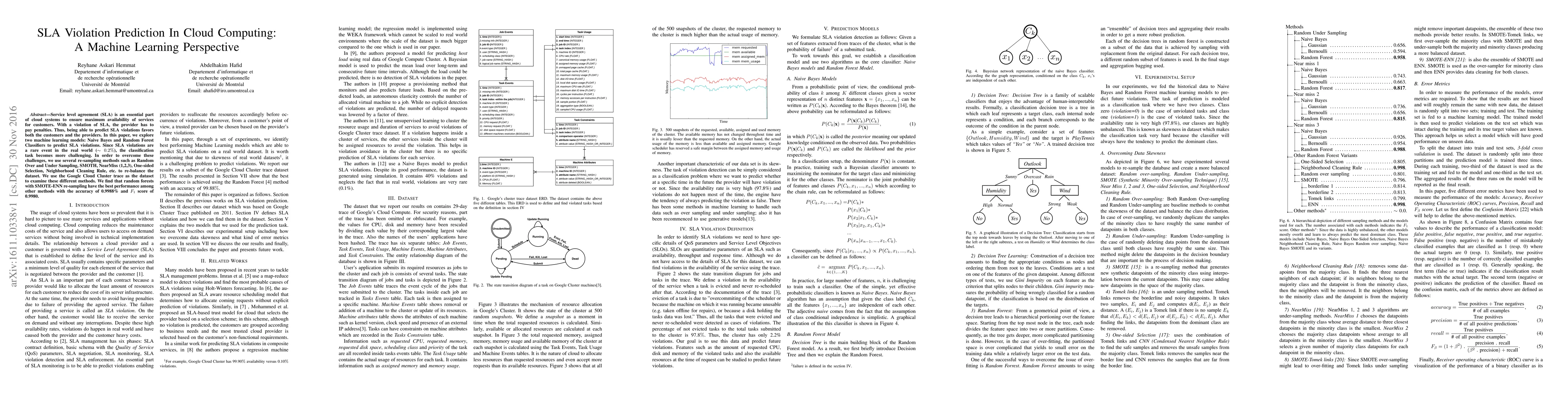 Service level agreement (SLA) is an essential part of cloud systems to ensure maximum availability of services for customers. With a violation of SLA, the provider has to pay penalties. In this paper, we explore two machine learning models: Naive Bayes and Random Forest Classifiers to predict SLA violations. Since SLA violations are a rare event in the real world (~0.2 %), the classification task becomes more challenging. In order to overcome these challenges, we use several re-sampling methods. We find that random forests with SMOTE-ENN re-sampling have the best performance among other methods with the accuracy of 99.88 % and F_1 score of 0.9980.