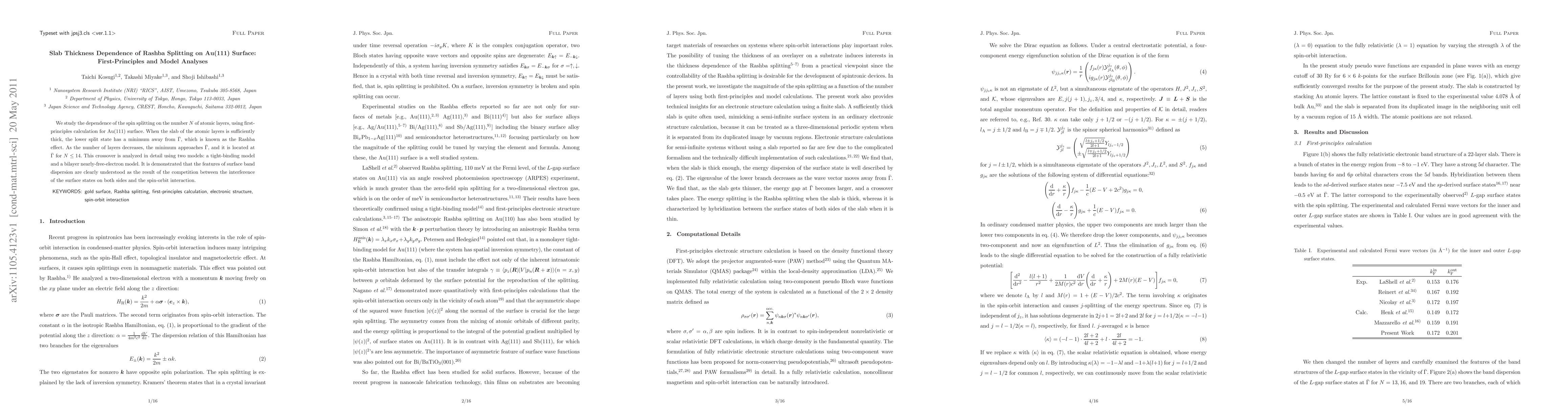 We study the dependence of the spin splitting on the number $N$ of atomic layers, using first-principles calculation for Au(111) surface. When the slab of the atomic layers is sufficiently thick, the lower split state has a minimum away from $\bar{\Gamma}$, which is known as the Rashba effect. As the number of layers decreases, the minimum approaches $\bar{\Gamma}$, and it is located at $\bar{\Gamma}$ for $N \leq 14$. This crossover is analyzed in detail using two models: a tight-binding model and a bilayer nearly-free-electron model. It is demonstrated that the features of surface band dispersion are clearly understood as the result of the competition between the interference of the surface states on both sides and the spin-orbit interaction.