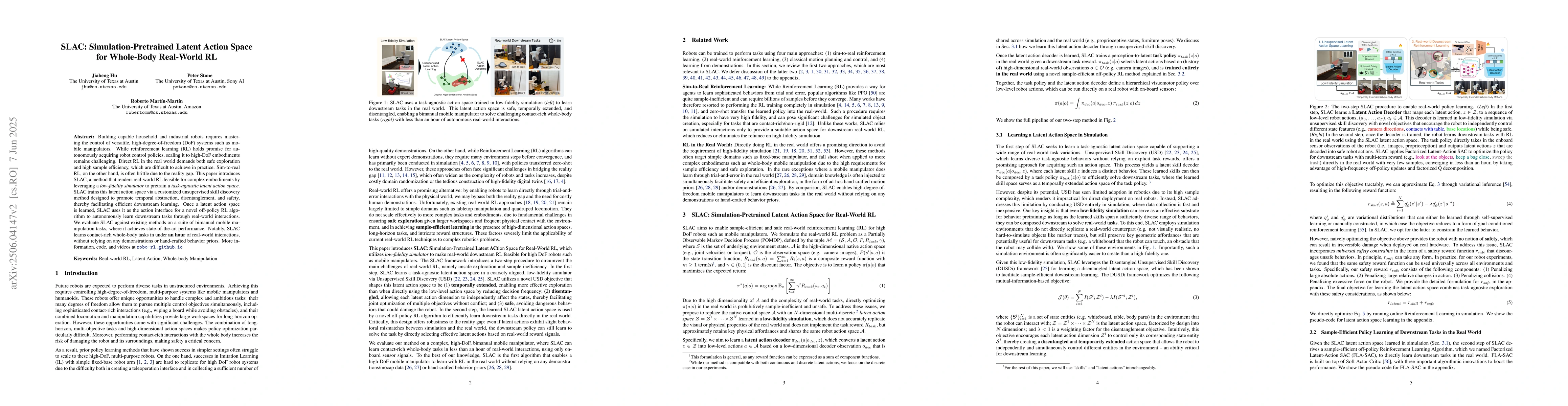 SLAC pretrains a task-agnostic latent action space using a low-fidelity simulator via a customized unsupervised skill discovery method. This method promotes temporal abstraction, disentanglement, and safety. The pretrained latent space is then used as an action interface for a novel off-policy RL algorithm to learn downstream tasks through real-world interactions.