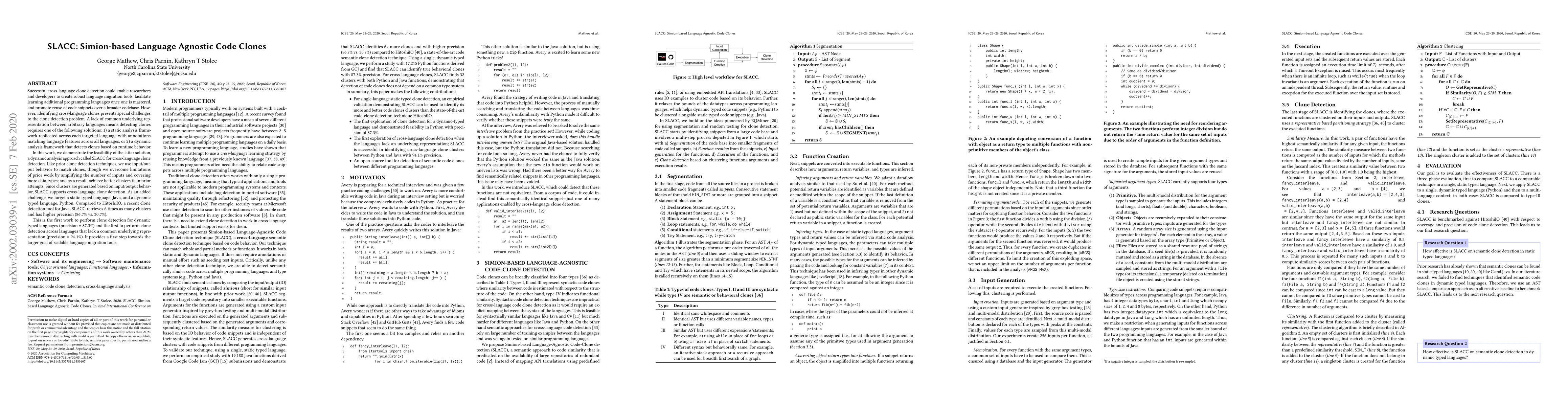 SLACC is a dynamic analysis framework for cross-language code clone detection, achieving superior clustering precision by amplifying input data types and behaviors compared to prior tools. It successfully detects clones across Java and Python, marking the first attempt at dynamic typed language clone detection and cross-language clone detection without a common underlying representation.