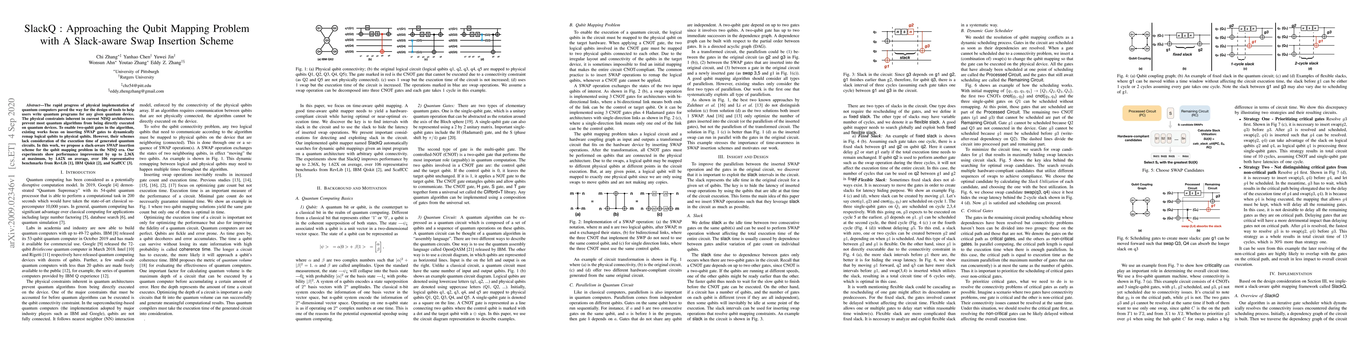 The paper introduces a slack-aware SWAP insertion scheme to address the qubit mapping problem in noisy intermediate-scale quantum (NISQ) devices, improving execution time. Experimental results show up to 2.36X performance improvement on average over 106 benchmarks.