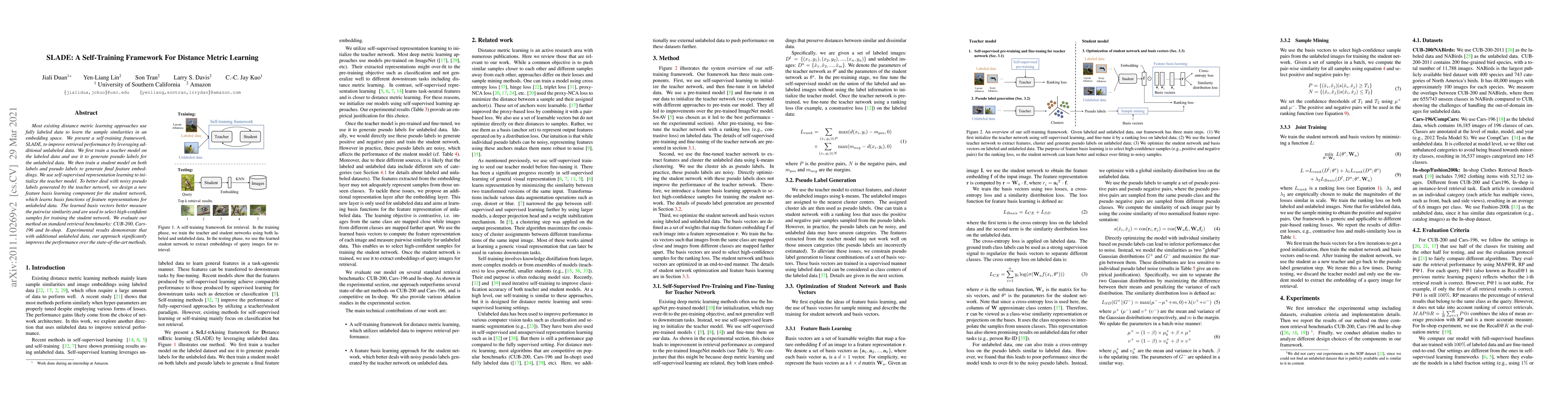 SLADE is a self-training framework for distance metric learning that leverages unlabeled data to enhance retrieval performance. It uses a teacher model to generate pseudo labels and a student model trained on both labeled and pseudo-labeled data, incorporating self-supervised learning and a feature basis learning component to handle noisy pseudo labels.