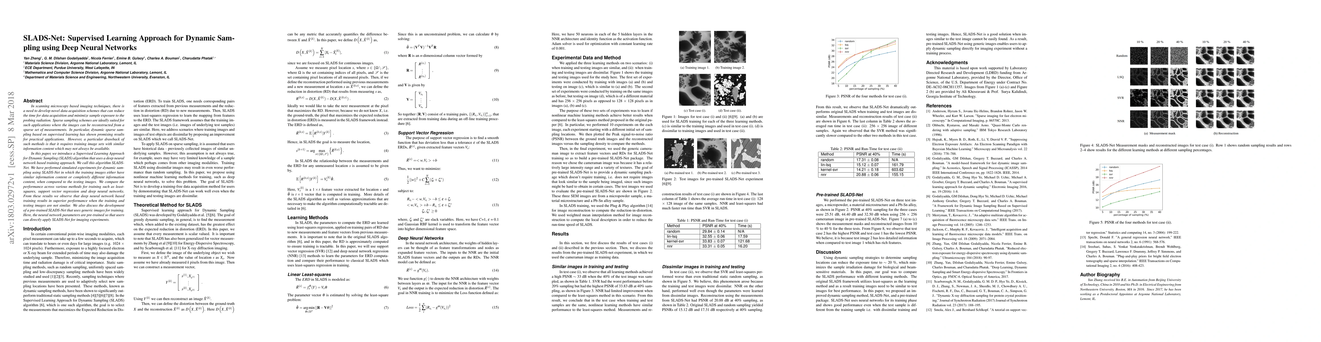 This paper introduces SLADS-Net, a supervised learning approach for dynamic sparse sampling in microscopy imaging, utilizing deep neural networks to improve data acquisition efficiency. Experiments show that deep neural networks outperform other training methods when training and testing images differ significantly, and a pre-trained model allows for direct application in imaging experiments.