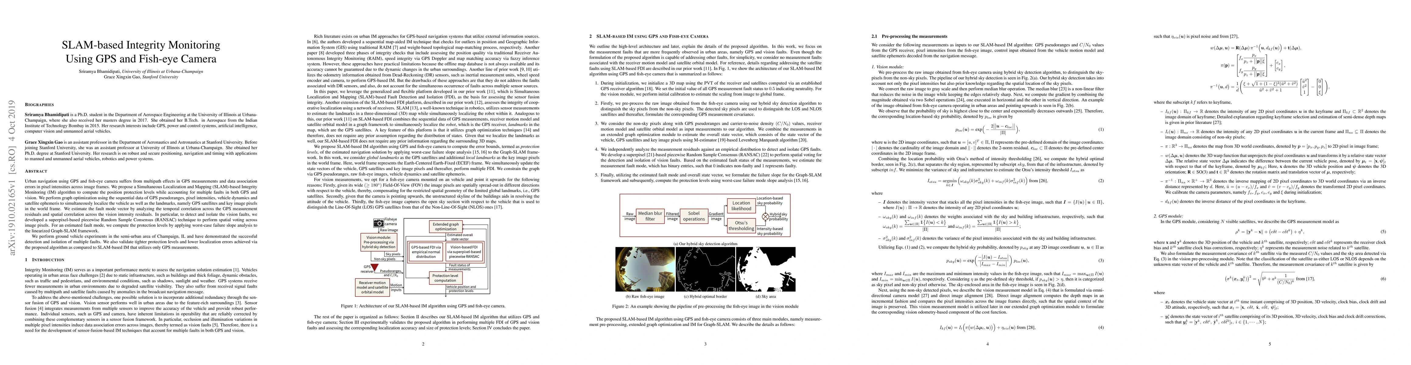 This paper proposes a SLAM-based Integrity Monitoring algorithm to detect and isolate faults in GPS and fish-eye camera data for urban navigation, achieving tighter protection levels and lower localization errors through graph optimization and superpixel-based RANSAC. Experiments in Champaign, IL validate the effectiveness of the method.