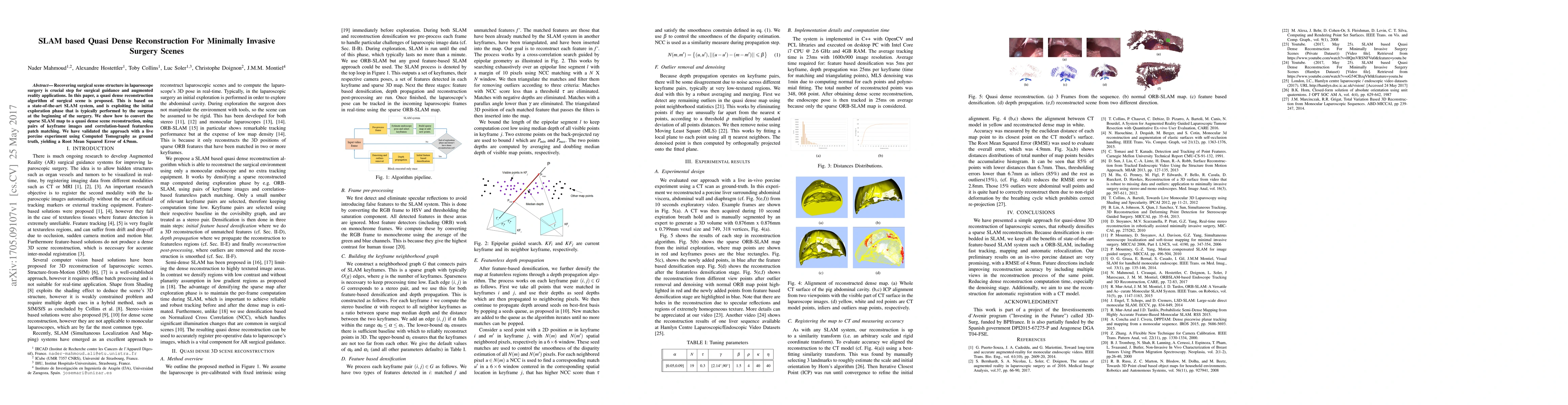 This paper proposes a quasi dense reconstruction algorithm for laparoscope surgery scenes, leveraging a state-of-the-art SLAM system to convert sparse maps into detailed reconstructions using featureless patch matching. The method was validated in a live porcine experiment, achieving a Root Mean Squared Error of 4.9mm compared to Computed Tomography ground truth.