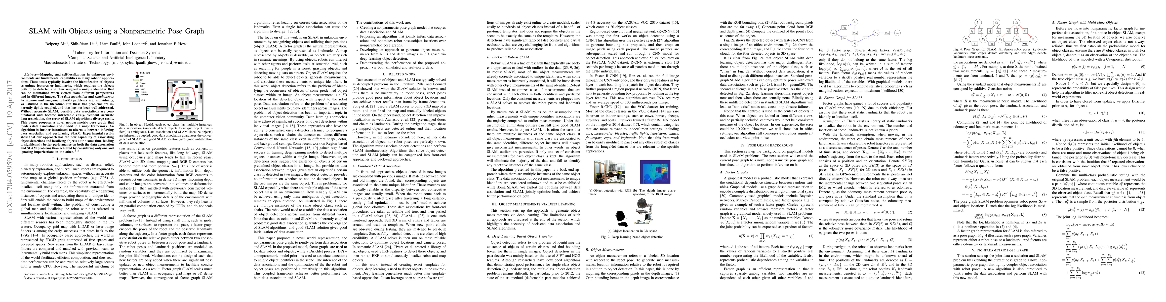 Mapping and self-localization in unknown environments are fundamental capabilities in many robotic applications. These tasks typically involve the identification of objects as unique features or landmarks, which requires the objects both to be detected and then assigned a unique identifier that can be maintained when viewed from different perspectives and in different images. The \textit{data association} and \textit{simultaneous localization and mapping} (SLAM) problems are, individually, well-studied in the literature. But these two problems are inherently tightly coupled, and that has not been well-addressed. Without accurate SLAM, possible data associations are combinatorial and become intractable easily. Without accurate data association, the error of SLAM algorithms diverge easily. This paper proposes a novel nonparametric pose graph that models data association and SLAM in a single framework. An algorithm is further introduced to alternate between inferring data association and performing SLAM. Experimental results show that our approach has the new capability of associating object detections and localizing objects at the same time, leading to significantly better performance on both the data association and SLAM problems than achieved by considering only one and ignoring imperfections in the other.