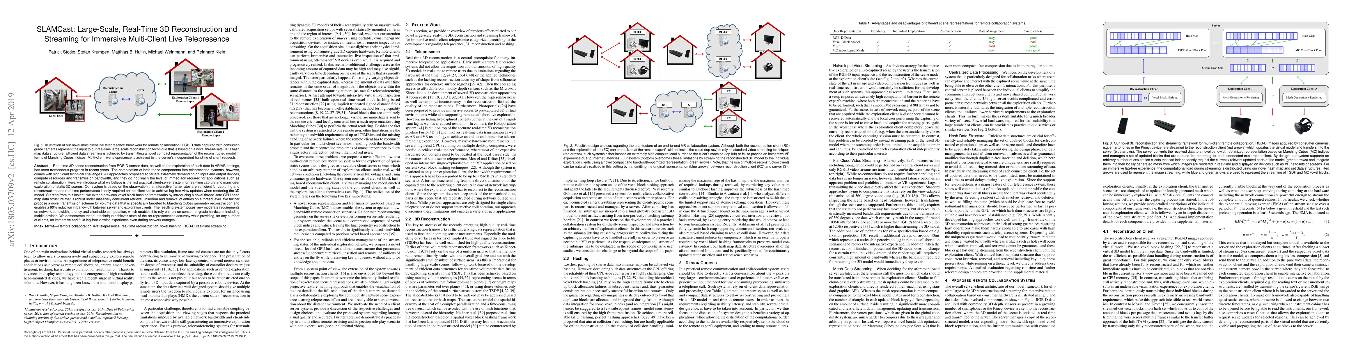 SLAMCast introduces a practical client-server system for real-time 3D reconstruction and streaming, enabling immersive multi-client live telepresence with minimal network requirements. It leverages a thread-safe GPU hash map and a novel transmission scheme to achieve high accuracy and fluid viewing experiences on consumer-grade hardware.