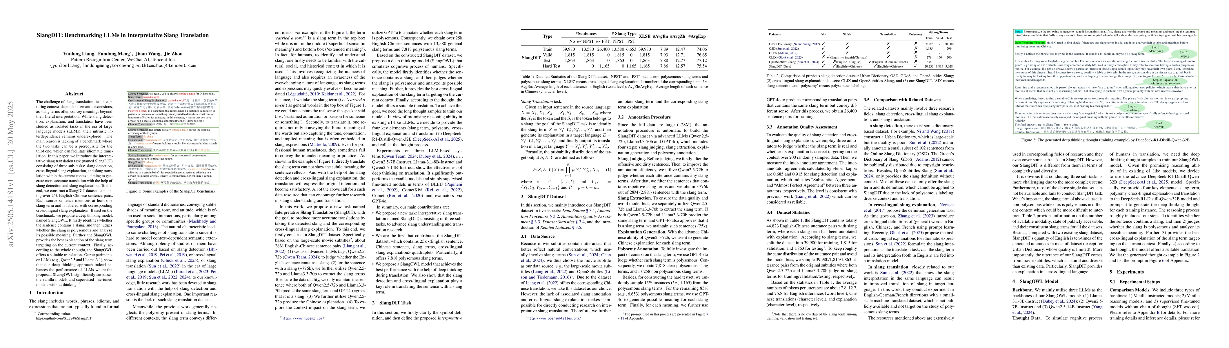 This research is important as it addresses the underexplored interdependence of slang detection, explanation, and translation tasks, facilitating idiomatic translation by providing a benchmark (SlangDIT) and a deep thinking model (SlangOWL) that improves LLMs' performance in slang translation.