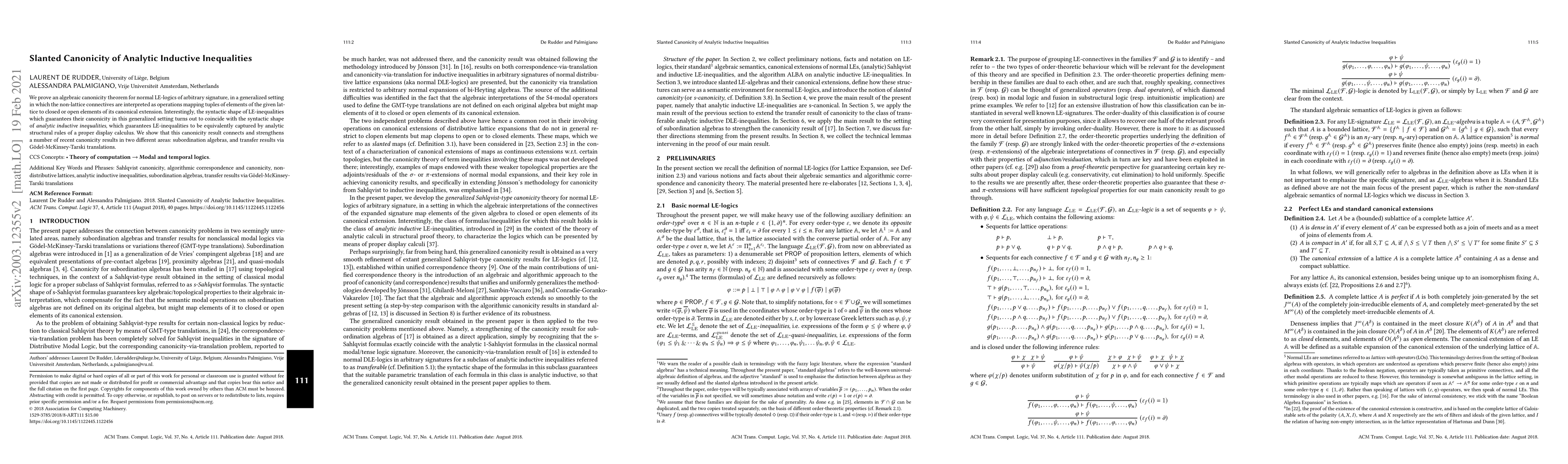 We prove an algebraic canonicity theorem for normal LE-logics of arbitrary signature, in a generalized setting in which the non-lattice connectives are interpreted as operations mapping tuples of elements of the given lattice to closed or open elements of its canonical extension. Interestingly, the syntactic shape of LE-inequalities which guarantees their canonicity in this generalized setting turns out to coincide with the syntactic shape of analytic inductive inequalities, which guarantees LE-inequalities to be equivalently captured by analytic structural rules of a proper display calculus. We show that this canonicity result connects and strengthens a number of recent canonicity results in two different areas: subordination algebras, and transfer results via G\"odel-McKinsey-Tarski translations.