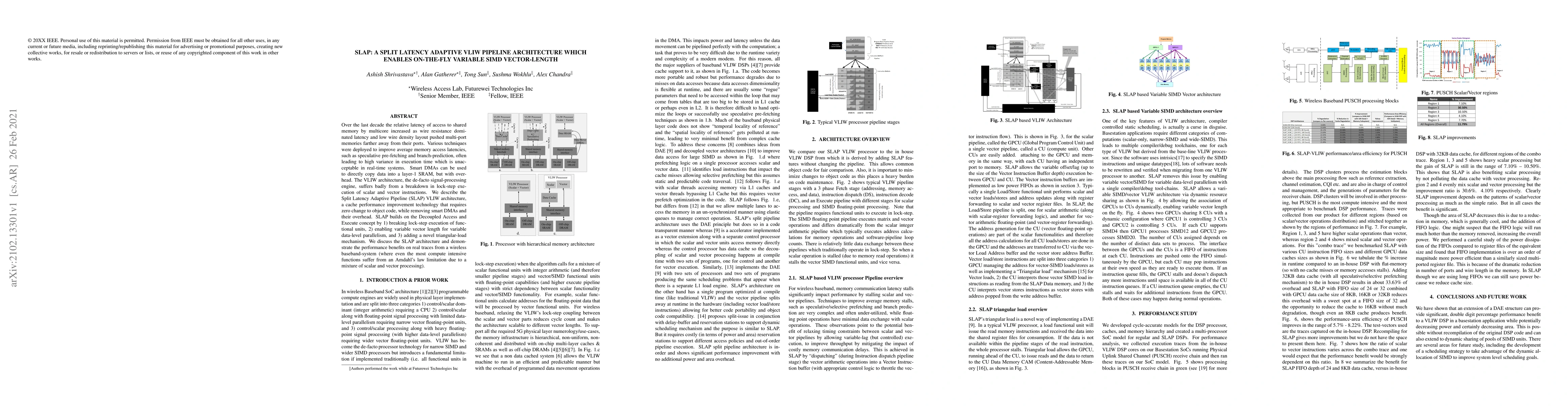 The SLAP VLIW architecture introduces a Split Latency Adaptive Pipeline to improve cache performance and memory access latency in multicore systems, enabling on-the-fly variable SIMD vector-length without altering object code. It achieves this by decoupling execution from access, allowing variable vector lengths, and using a novel triangular load mechanism, thereby eliminating the need for smart DMAs and their overhead.