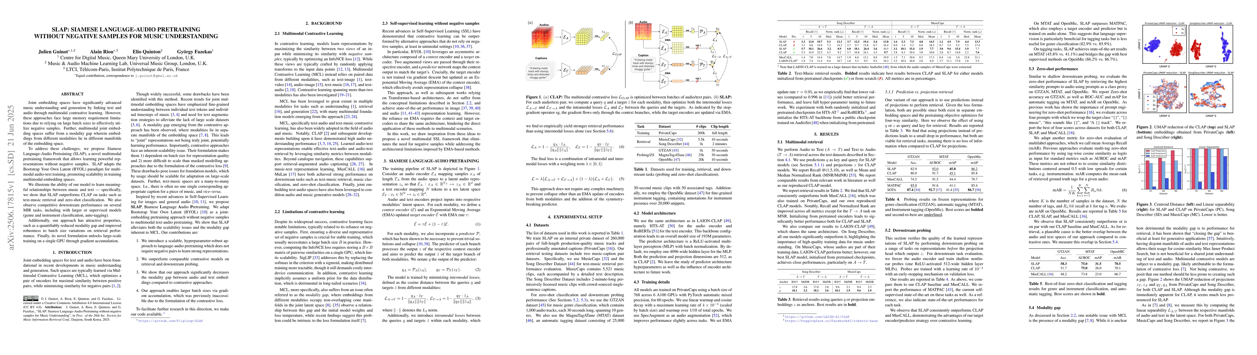 Joint embedding spaces have significantly advanced music understanding and generation by linking text and audio through multimodal contrastive learning. However, these approaches face large memory requirement limitations due to relying on large batch sizes to effectively utilize negative samples. Further, multimodal joint embedding spaces suffer from a modality gap wherein embeddings from different modalities lie in different manifolds of the embedding space. To address these challenges, we propose Siamese Language-Audio Pretraining (SLAP), a novel multimodal pretraining framework that allows learning powerful representations without negative samples. SLAP adapts the Bootstrap Your Own Latent (BYOL) paradigm for multimodal audio-text training, promoting scalability in training multimodal embedding spaces. We illustrate the ability of our model to learn meaningful relationships between music and text -- specifically, we show that SLAP outperforms CLAP on tasks such as text-music retrieval and zero-shot classification. We also observe competitive downstream performance on several MIR tasks, including with larger or supervised models (genre and instrument classification, auto-tagging). Additionally, our approach has attractive properties, such as a quantifiably reduced modality gap and improved robustness to batch size variations on retrieval performance. Finally, its novel formulation unlocks large-scale training on a single GPU through gradient accumulation.