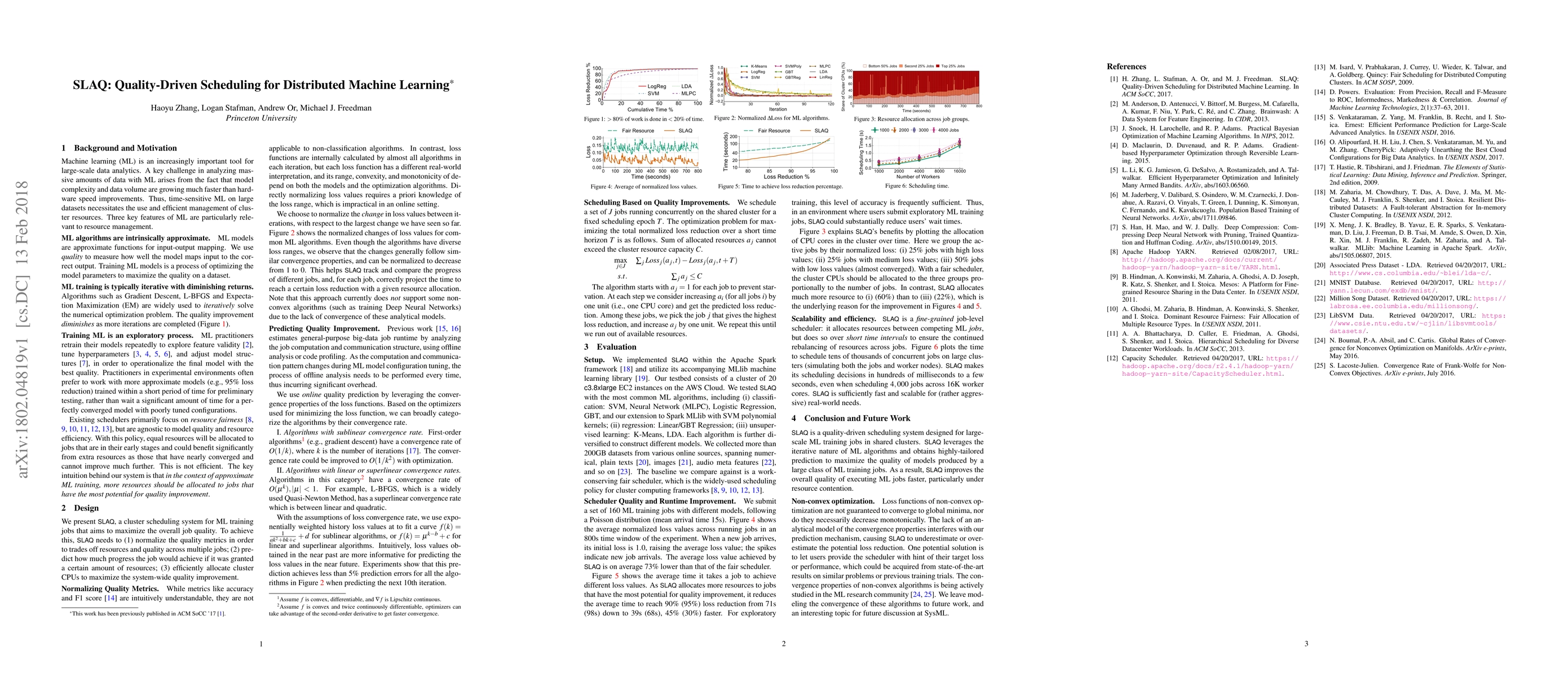 Training machine learning (ML) models with large datasets can incur significant resource contention on shared clusters. This training typically involves many iterations that continually improve the quality of the model. Yet in exploratory settings, better models can be obtained faster by directing resources to jobs with the most potential for improvement. We describe SLAQ, a cluster scheduling system for approximate ML training jobs that aims to maximize the overall job quality. When allocating cluster resources, SLAQ explores the quality-runtime trade-offs across multiple jobs to maximize system-wide quality improvement. To do so, SLAQ leverages the iterative nature of ML training algorithms, by collecting quality and resource usage information from concurrent jobs, and then generating highly-tailored quality-improvement predictions for future iterations. Experiments show that SLAQ achieves an average quality improvement of up to 73% and an average delay reduction of up to 44% on a large set of ML training jobs, compared to resource fairness schedulers.