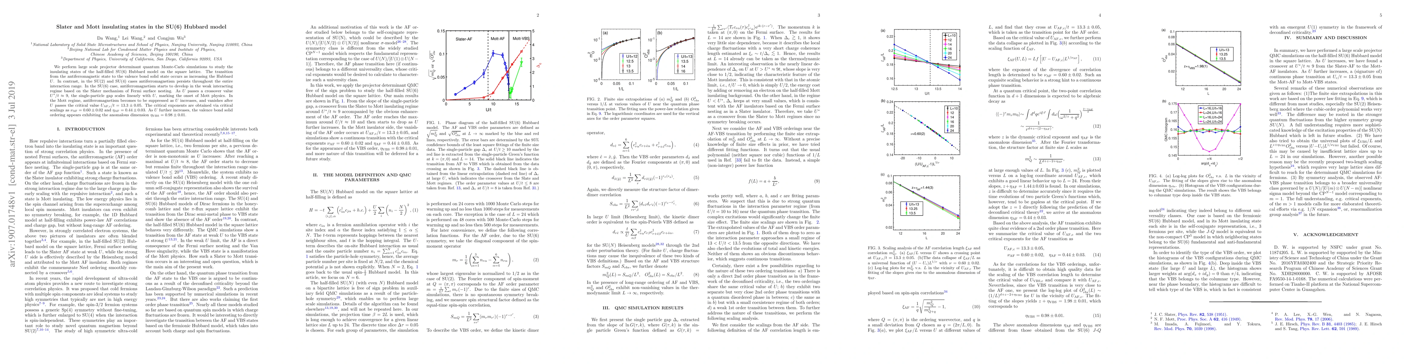 We perform large scale projector determinant quantum Monte-Carlo simulations to study the insulating states of the half-filled SU(6) Hubbard model on the square lattice. The transition from the antiferromagnetic state to the valence bond solid state occurs as increasing the Hubbard $U$. In contrast, in the SU(2) and SU(4) cases antiferromagnetism persists throughout the entire interaction range. In the SU(6) case, antiferromagnetism starts to develop in the weak interacting regime based on the Slater mechanism of Fermi surface nesting. As $U$ passes a crossover value $U^*/t\approx 9$, the single-particle gap scales linearly with $U$, marking the onset of Mott physics. In the Mott regime, antiferromagnetism becomes to be suppressed as $U$ increases, and vanishes after $U$ passes the critical value $U_{\rm AF,c}/t=13.3\pm 0.05$. The critical exponents are obtained via critical scalings as $\nu_{\rm AF}=0.60\pm 0.02$ and $\eta_{\rm AF}=0.44\pm 0.03$. As $U$ further increases, the valence bond solid ordering appears exhibiting the anomalous dimension $\eta_{\rm VBS}=0.98\pm 0.01$.