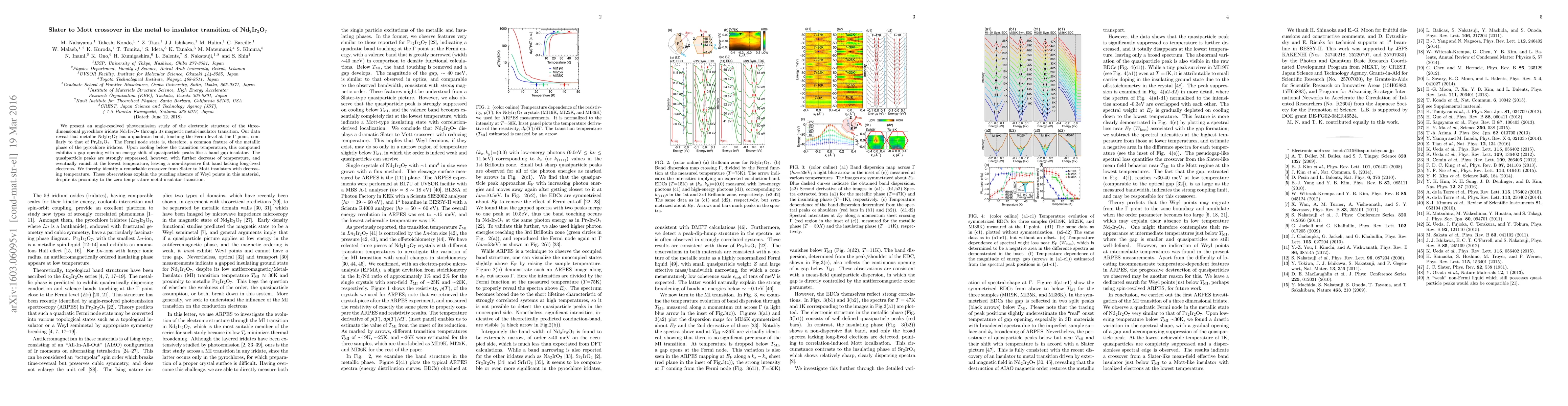 The study reveals that Nd2Ir2O7 undergoes a metal to insulator transition, transitioning from a Slater-type metal with a quadratic Fermi surface to a Mott-type insulator with a gap and vanishing quasiparticles at low temperatures. The findings highlight a unique crossover mechanism in the electronic structure of pyrochlore iridates.