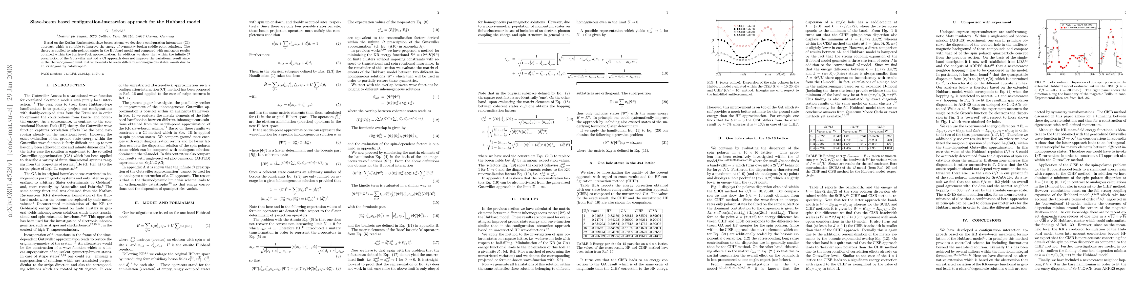 Based on the Kotliar-Ruckenstein slave-boson scheme we develop a configuration-interaction (CI) approach which is suitable to improve the energy of symmetry-broken saddle-point solutions. The theory is applied to spin-polaron states in the Hubbard model and compared with analogous results obtained within the Hartree-Fock approximation. In addition we show that within the infinite ${\cal D}$ prescription of the Gutzwiller method a CI approach does not improve the variational result since in the thermodynamic limit matrix elements between different inhomogeneous states vanish due to an 'orthogonality catastrophe'.
