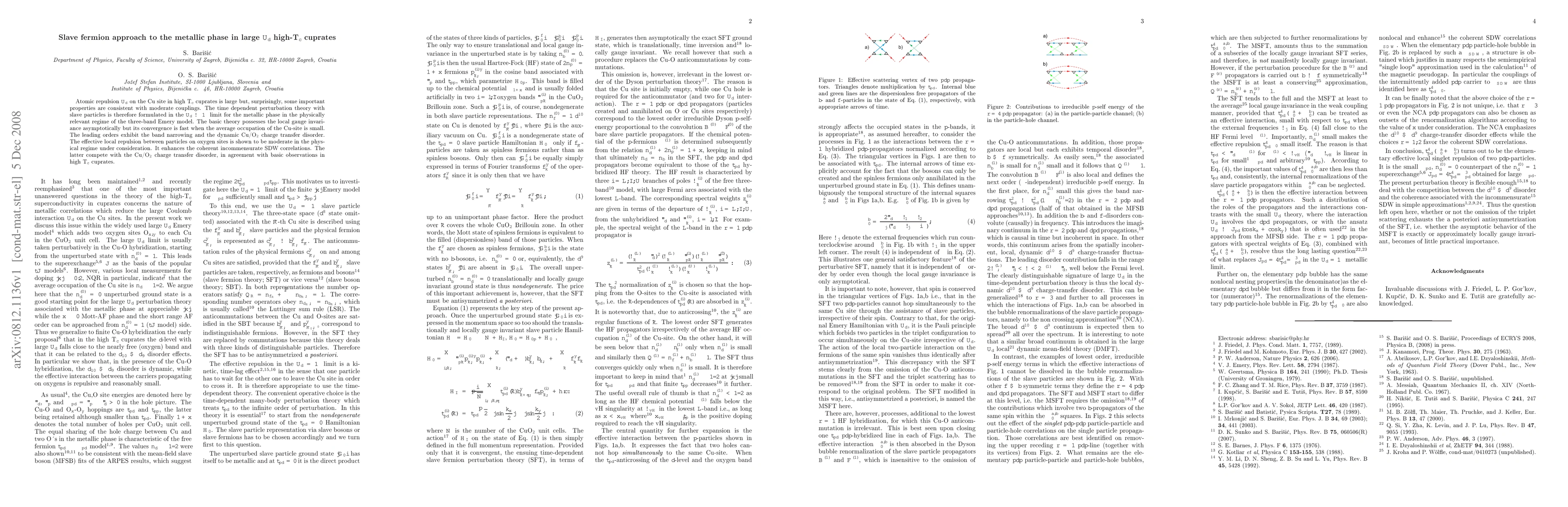 Atomic repulsion $U_d$ on the Cu site in high T$_c$ cuprates is large but, surprisingly, some important properties are consistent with moderate couplings. The time dependent perturbation theory with slave particles is therefore formulated in the $U_d\to\infty$ limit for the metallic phase in the physically relevant regime of the three-band Emery model. The basic theory possesses the local gauge invariance asymptotically but its convergence is fast when the average occupation of the Cu-site is small. The leading orders exhibit the band narrowing and the dynamic Cu/O$_2$ charge transfer disorder. The effective local repulsion between particles on oxygen sites is shown to be moderate in the physical regime under consideration. It enhances the coherent incommensurate SDW correlations. The latter compete with the Cu/O$_2$ charge transfer disorder, in agreement with basic observations in high T$_c$ cuprates.