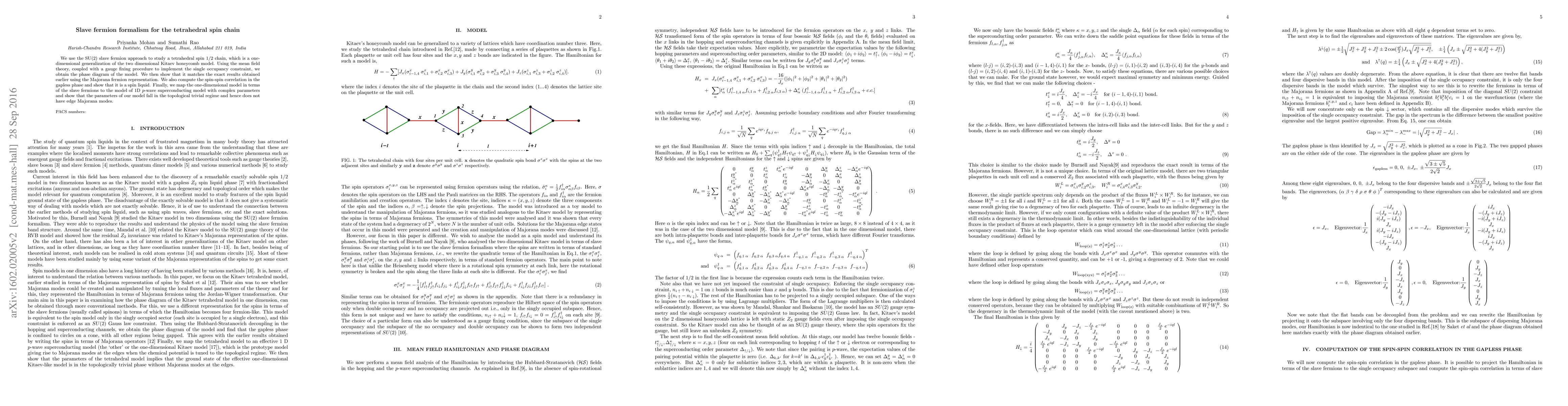 We use the SU(2) slave fermion approach to study a tetrahedral spin 1/2 chain, which is a one-dimensional generalization of the two dimensional Kitaev honeycomb model. Using the mean field theory, coupled with a gauge fixing procedure to implement the single occupancy constraint, we obtain the phase diagram of the model. We then show that it matches the exact results obtained earlier using the Majorana fermion representation. We also compute the spin-spin correlation in the gapless phase and show that it is a spin liquid. Finally, we map the one-dimensional model in terms of the slave fermions to the model of 1D p-wave superconducting model with complex parameters and show that the parameters of our model fall in the topological trivial regime and hence does not have edge Majorana modes.
