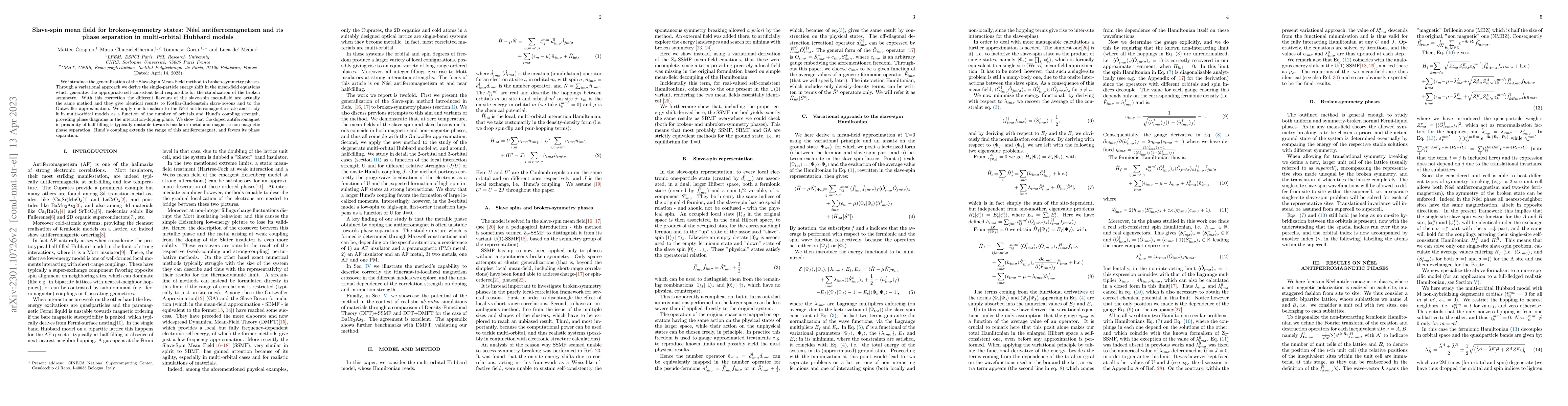 We introduce the generalization of the Slave-Spin Mean-Field method to broken-symmetry phases. Through a variational approach we derive the single-particle energy shift in the mean-field equations which generates the appropriate self-consistent field responsible for the stabilization of the broken symmetry. With this correction the different flavours of the slave-spin mean-field are actually the same method and they give identical results to Kotliar-Ruckenstein slave-bosons and to the Gutzwiller approximation. We apply our formalism to the N\'eel antiferromagnetic state and study it in multi-orbital models as a function of the number of orbitals and Hund's coupling strength, providing phase diagrams in the interaction-doping plane. We show that the doped antiferromagnet in proximity of half-filling is typically unstable towards insulator-metal and magnetic-non magnetic phase separation. Hund's coupling extends the range of this antiferromagnet, and favors its phase separation.