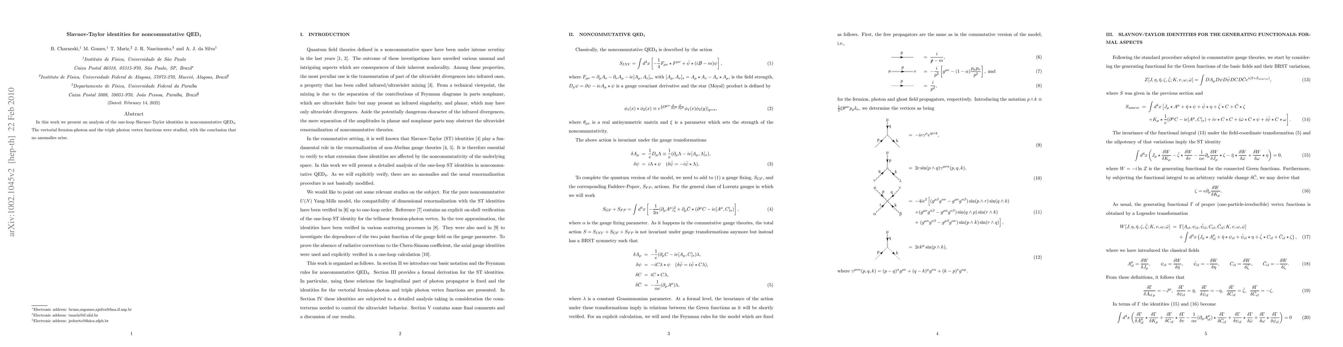 In this work we present an analysis of the one-loop Slavnov-Taylor identities in noncommutative QED$_4$. The vectorial fermion-photon and the triple photon vertex functions were studied, with the conclusion that no anomalies arise.