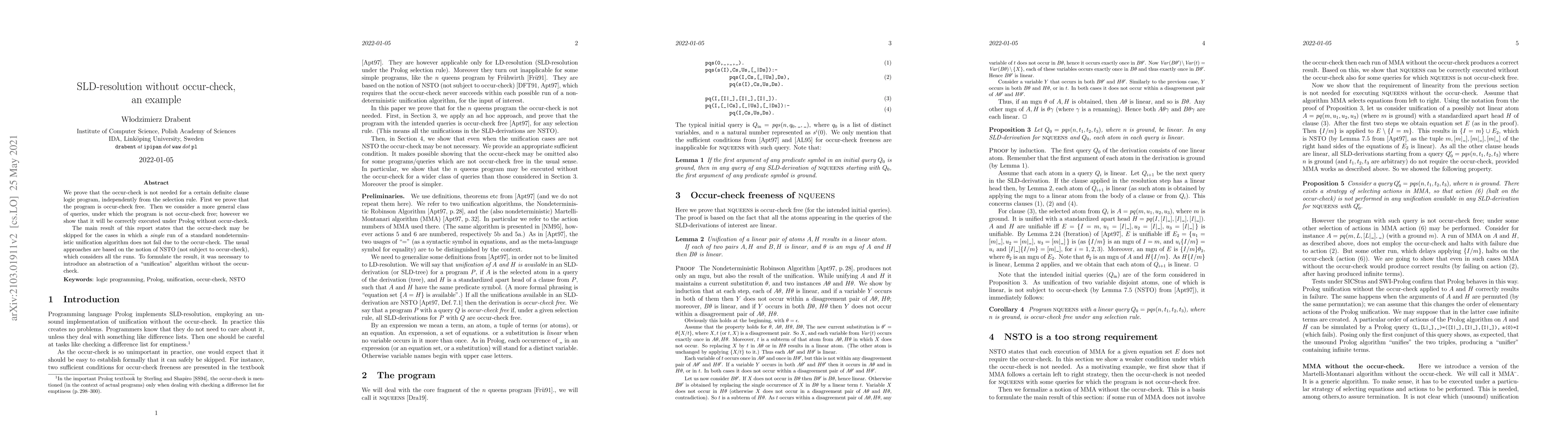 We prove that the occur-check is not needed for a certain definite clause logic program, independently from the selection rule. First we prove that the program is occur-check free. Then we consider a more general class of queries, under which the program is not occur-check free; however we show that it will be correctly executed under Prolog without occur-check. The main result of this report states that the occur-check may be skipped for the cases in which a single run of a standard nondeterministic unification algorithm does not fail due to the occur-check. The usual approaches are based on the notion of NSTO (not subject to occur-check), which considers all the runs. To formulate the result, it was necessary to introduce an abstraction of a "unification" algorithm without the occur-check.