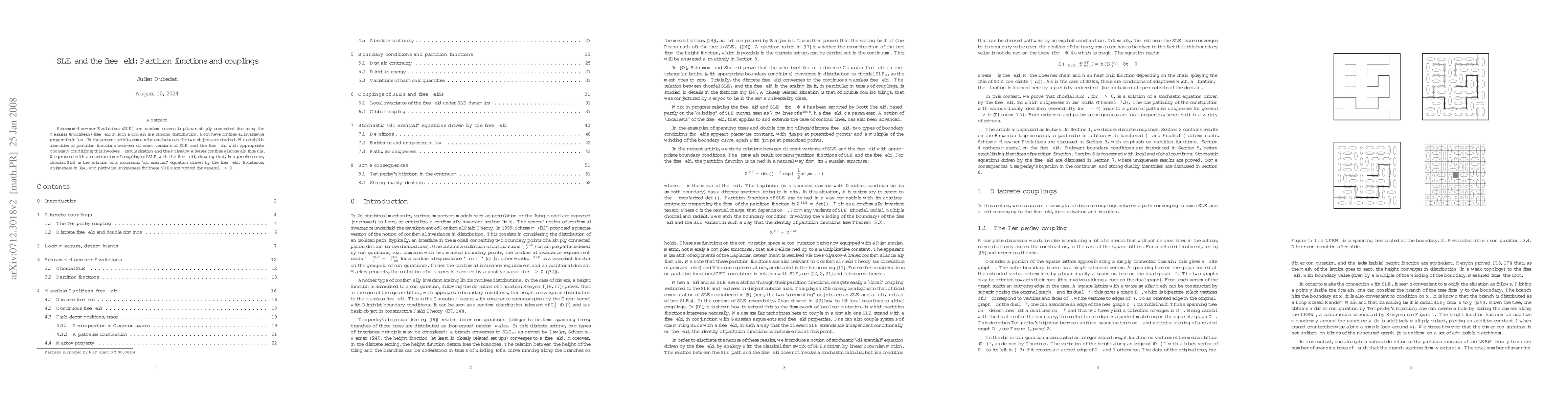 This paper investigates connections between Schramm-Loewner Evolutions ($\SLE$) and the massless free field, establishing identities of partition functions and constructing couplings. It proves the existence and uniqueness of stochastic differential equations driving chordal $\SLE$ by the free field, utilizing $\zeta$-regularization and conformal anomaly formulas.