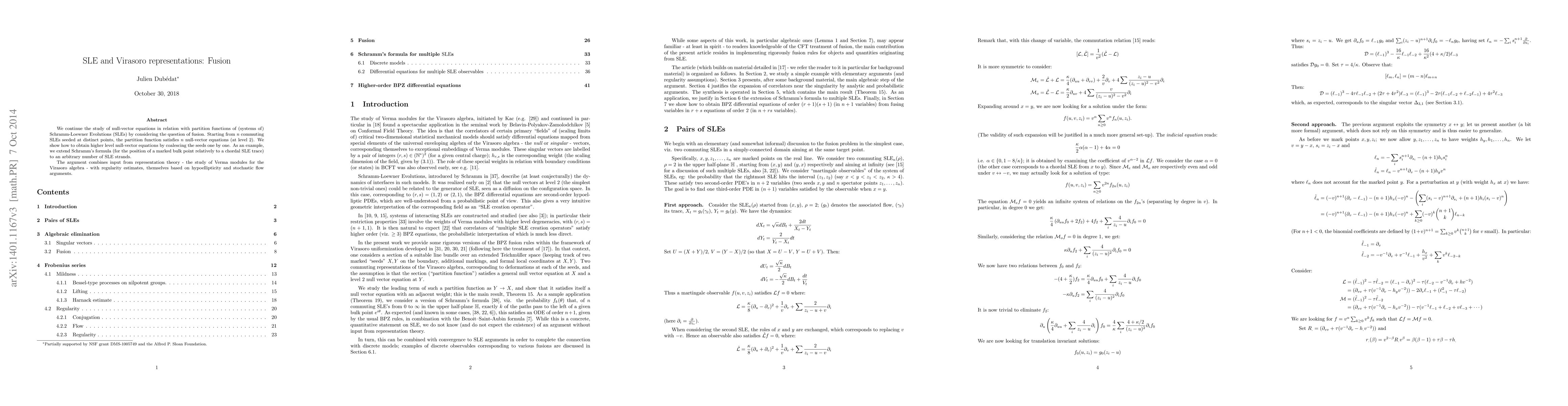 This paper explores the fusion of null-vector equations in the context of Schramm-Loewner Evolutions (SLEs) and their partition functions, extending Schramm's formula to multiple SLE strands. It combines insights from Virasoro algebra representation theory and stochastic flow arguments to derive higher-level null-vector equations.