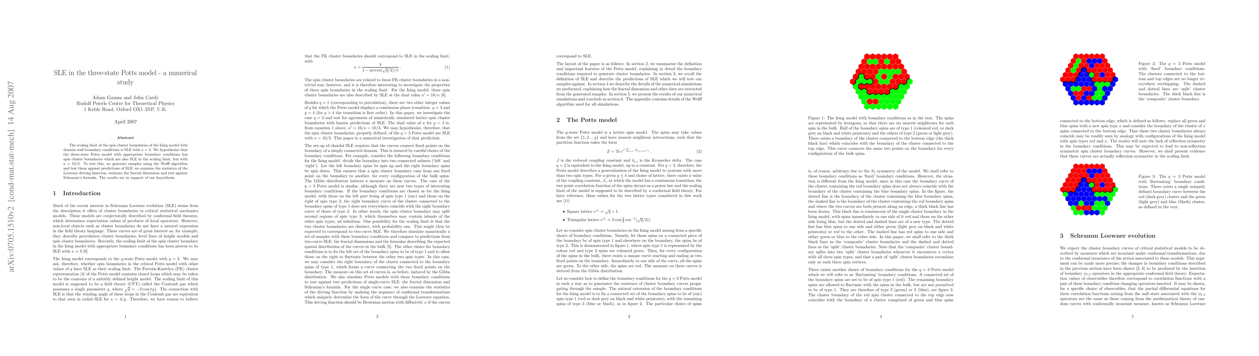 The scaling limit of the spin cluster boundaries of the Ising model with domain wall boundary conditions is SLE with kappa=3. We hypothesise that the three-state Potts model with appropriate boundary conditions has spin cluster boundaries which are also SLE in the scaling limit, but with kappa=10/3. To test this, we generate samples using the Wolff algorithm and test them against predictions of SLE: we examine the statistics of the Loewner driving function, estimate the fractal dimension and test against Schramm's formula. The results are in support of our hypothesis.