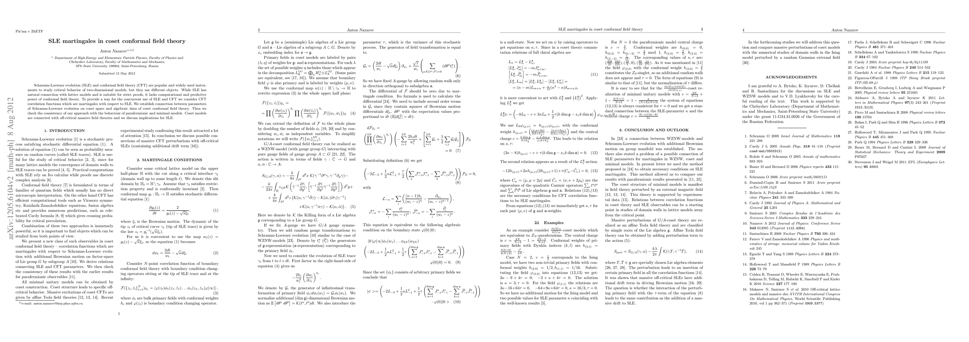 This paper establishes a connection between Schramm-Loewner evolution (SLE) and conformal field theory (CFT) by examining CFT correlation functions that act as martingales with respect to SLE. It links SLE parameters on coset spaces to CFT data, verifying consistency through parafermionic and minimal models, and discusses implications for off-critical massive field theories.