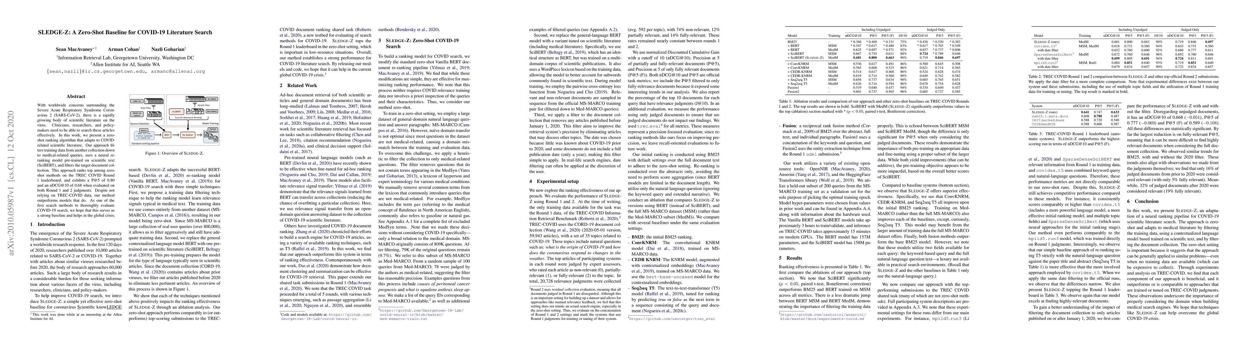With worldwide concerns surrounding the Severe Acute Respiratory Syndrome Coronavirus 2 (SARS-CoV-2), there is a rapidly growing body of scientific literature on the virus. Clinicians, researchers, and policy-makers need to be able to search these articles effectively. In this work, we present a zero-shot ranking algorithm that adapts to COVID-related scientific literature. Our approach filters training data from another collection down to medical-related queries, uses a neural re-ranking model pre-trained on scientific text (SciBERT), and filters the target document collection. This approach ranks top among zero-shot methods on the TREC COVID Round 1 leaderboard, and exhibits a P@5 of 0.80 and an nDCG@10 of 0.68 when evaluated on both Round 1 and 2 judgments. Despite not relying on TREC-COVID data, our method outperforms models that do. As one of the first search methods to thoroughly evaluate COVID-19 search, we hope that this serves as a strong baseline and helps in the global crisis.
