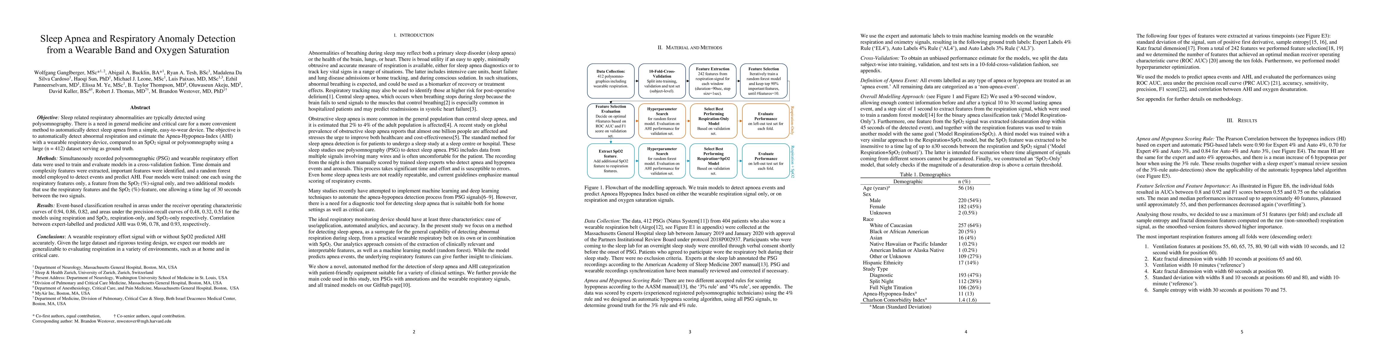 Objective: Sleep related respiratory abnormalities are typically detected using polysomnography. There is a need in general medicine and critical care for a more convenient method to automatically detect sleep apnea from a simple, easy-to-wear device. The objective is to automatically detect abnormal respiration and estimate the Apnea-Hypopnea-Index (AHI) with a wearable respiratory device, compared to an SpO2 signal or polysomnography using a large (n = 412) dataset serving as ground truth. Methods: Simultaneously recorded polysomnographic (PSG) and wearable respiratory effort data were used to train and evaluate models in a cross-validation fashion. Time domain and complexity features were extracted, important features were identified, and a random forest model employed to detect events and predict AHI. Four models were trained: one each using the respiratory features only, a feature from the SpO2 (%)-signal only, and two additional models that use the respiratory features and the SpO2 (%)-feature, one allowing a time lag of 30 seconds between the two signals. Results: Event-based classification resulted in areas under the receiver operating characteristic curves of 0.94, 0.86, 0.82, and areas under the precision-recall curves of 0.48, 0.32, 0.51 for the models using respiration and SpO2, respiration-only, and SpO2-only respectively. Correlation between expert-labelled and predicted AHI was 0.96, 0.78, and 0.93, respectively. Conclusions: A wearable respiratory effort signal with or without SpO2 predicted AHI accurately. Given the large dataset and rigorous testing design, we expect our models are generalizable to evaluating respiration in a variety of environments, such as at home and in critical care.