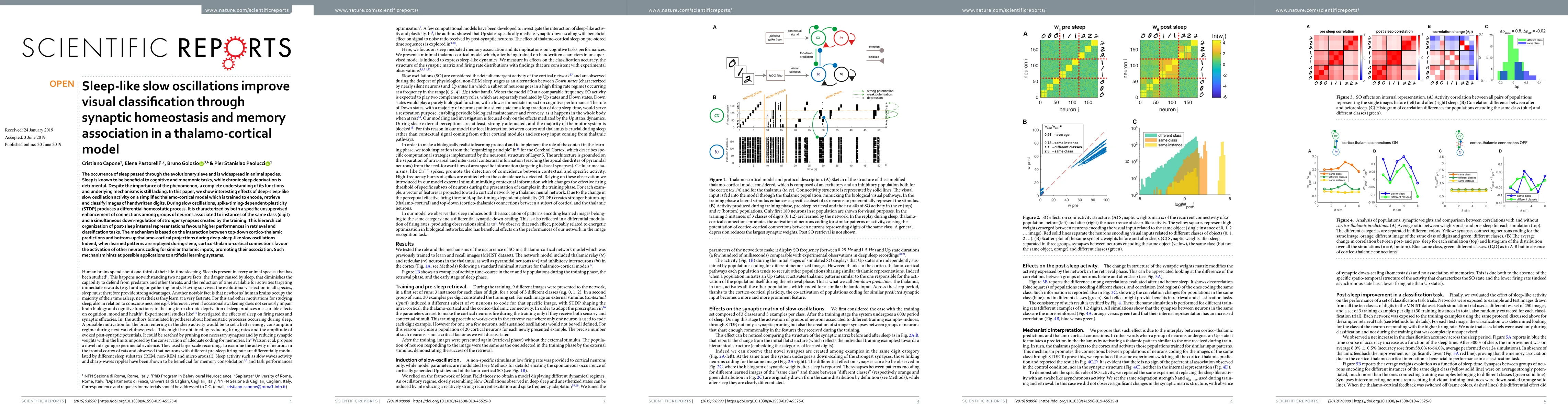 This paper demonstrates that sleep-like slow oscillations enhance visual classification in a thalamo-cortical model through synaptic homeostasis and memory association, showing improved retrieval and classification performance via enhanced connections among neurons of the same class and down-regulation of over-strong synapses. The mechanism involves interactions between top-down predictions and bottom-up projections during slow oscillations.