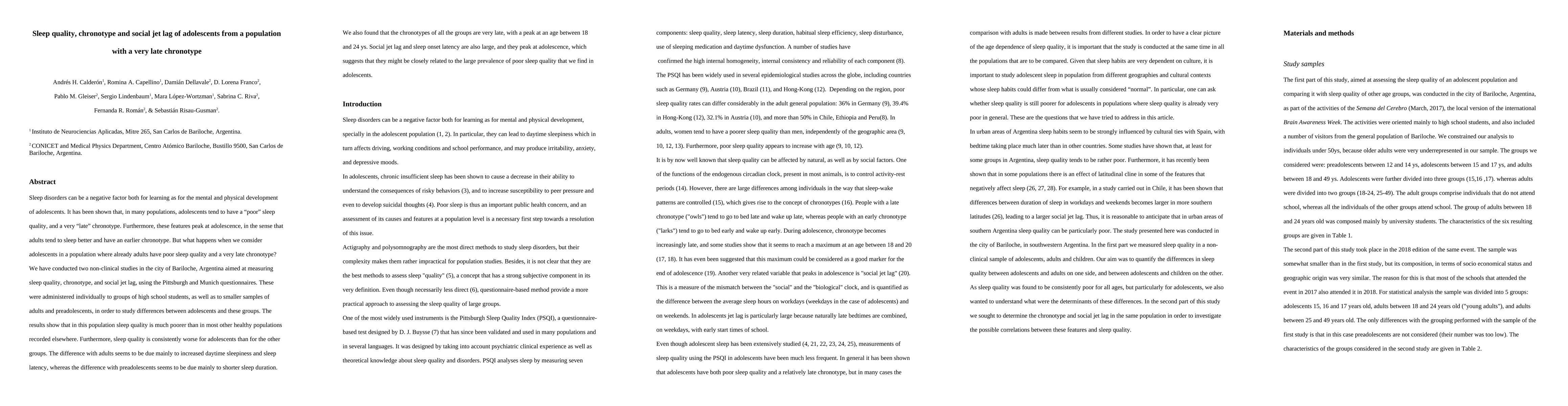 Sleep disorders can be a negative factor both for learning as for the mental and physical development of adolescents. It has been shown that, in many populations, adolescents tend to have a poor sleep quality, and a very late chronotype. Furthermore, these features peak at adolescence, in the sense that adults tend to sleep better and have an earlier chronotype. But what happens when we consider adolescents in a population where already adults have poor sleep quality and a very late chronotype? We have conducted two non-clinical studies in the city of Bariloche, Argentina aimed at measuring sleep quality, chronotype, and social jet lag, using the Pittsburgh and Munich questionnaires. These were administered individually to groups of high school students, as well as to smaller samples of adults and preadolescents, in order to study differences between adolescents and these groups. The results show that in this population sleep quality is much poorer than in most other healthy populations recorded elsewhere. Furthermore, sleep quality is consistently worse for adolescents than for the other groups. The difference with adults seems to be due mainly to increased daytime sleepiness and sleep latency, whereas the difference with preadolescents seems to be due mainly to shorter sleep duration. We also found that the chronotypes of all the groups are very late, with a peak at an age between 18 and 24 ys. Social jet lag and sleep onset latency are also large, and they peak at adolescence, which suggests that they might be closely related to the large prevalence of poor sleep quality that we find in adolescents.