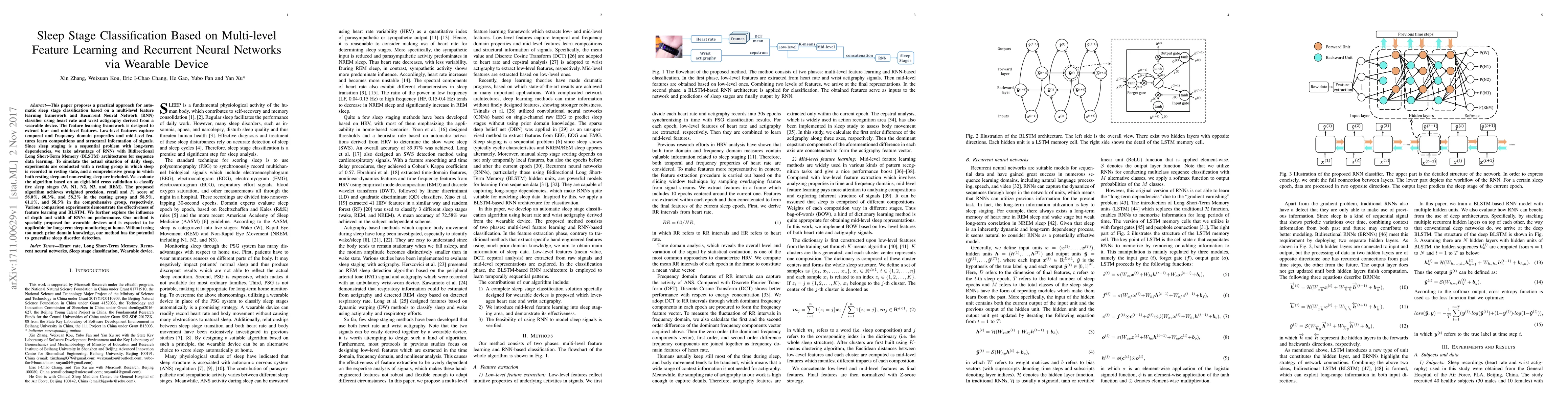 This paper presents an automatic sleep stage classification method using multi-level feature learning and Recurrent Neural Networks (RNN) with Bidirectional Long Short-Term Memory (BLSTM) architectures, based on heart rate and wrist actigraphy from wearable devices. The proposed algorithm achieves high precision, recall, and F1 score, demonstrating its effectiveness for long-term sleep monitoring at home.