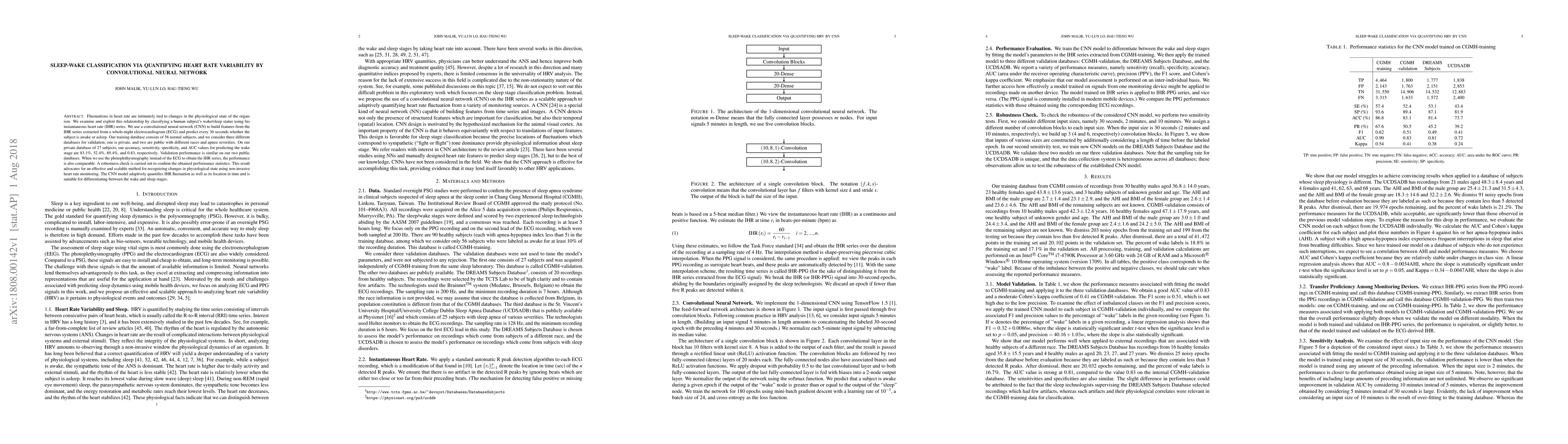 This paper proposes a convolutional neural network (CNN) to classify wake/sleep states using heart rate variability from electrocardiogram (ECG) data. The model achieves high accuracy (83.1%) on a private database and maintains similar performance on public datasets, demonstrating the effectiveness of non-invasive heart rate monitoring for sleep-wake classification.
